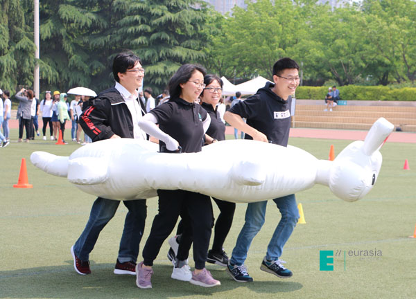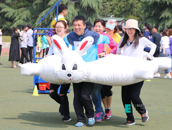 教职工龟兔赛跑趣味项目,参与人数为250余人,10人一组,大家集体协作,相互配合和鼓励,统统完成比赛,比赛过程,欢声笑语不断,该活动让大家体会到了团队协作的魅力和欢乐。