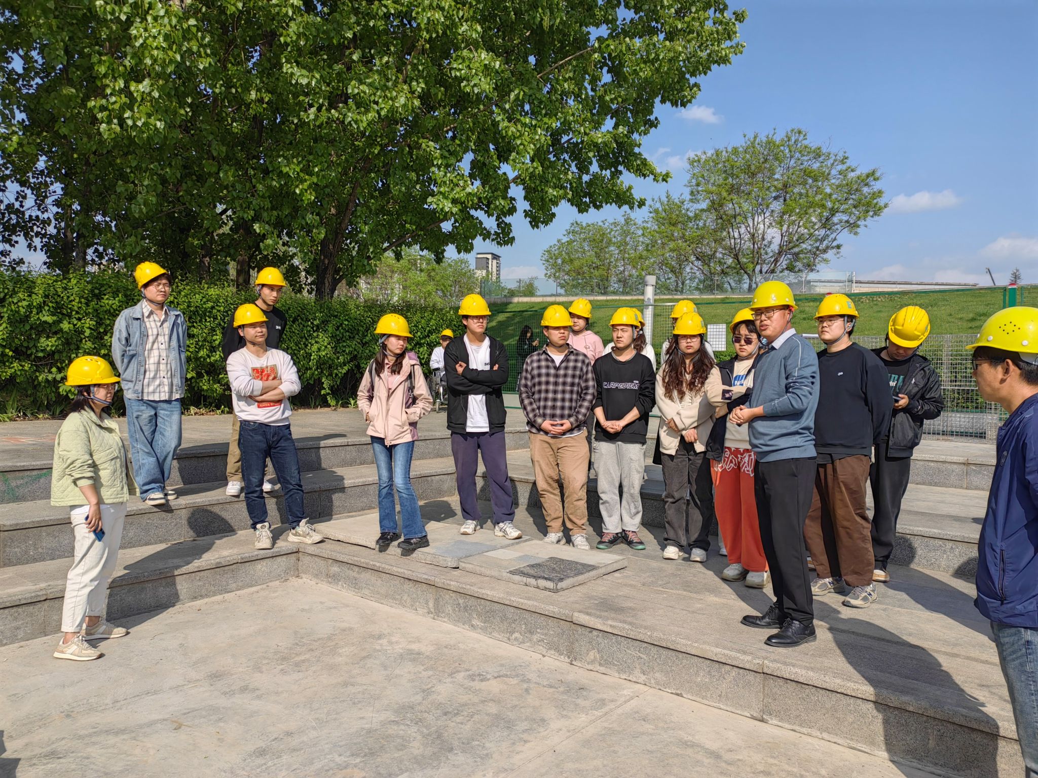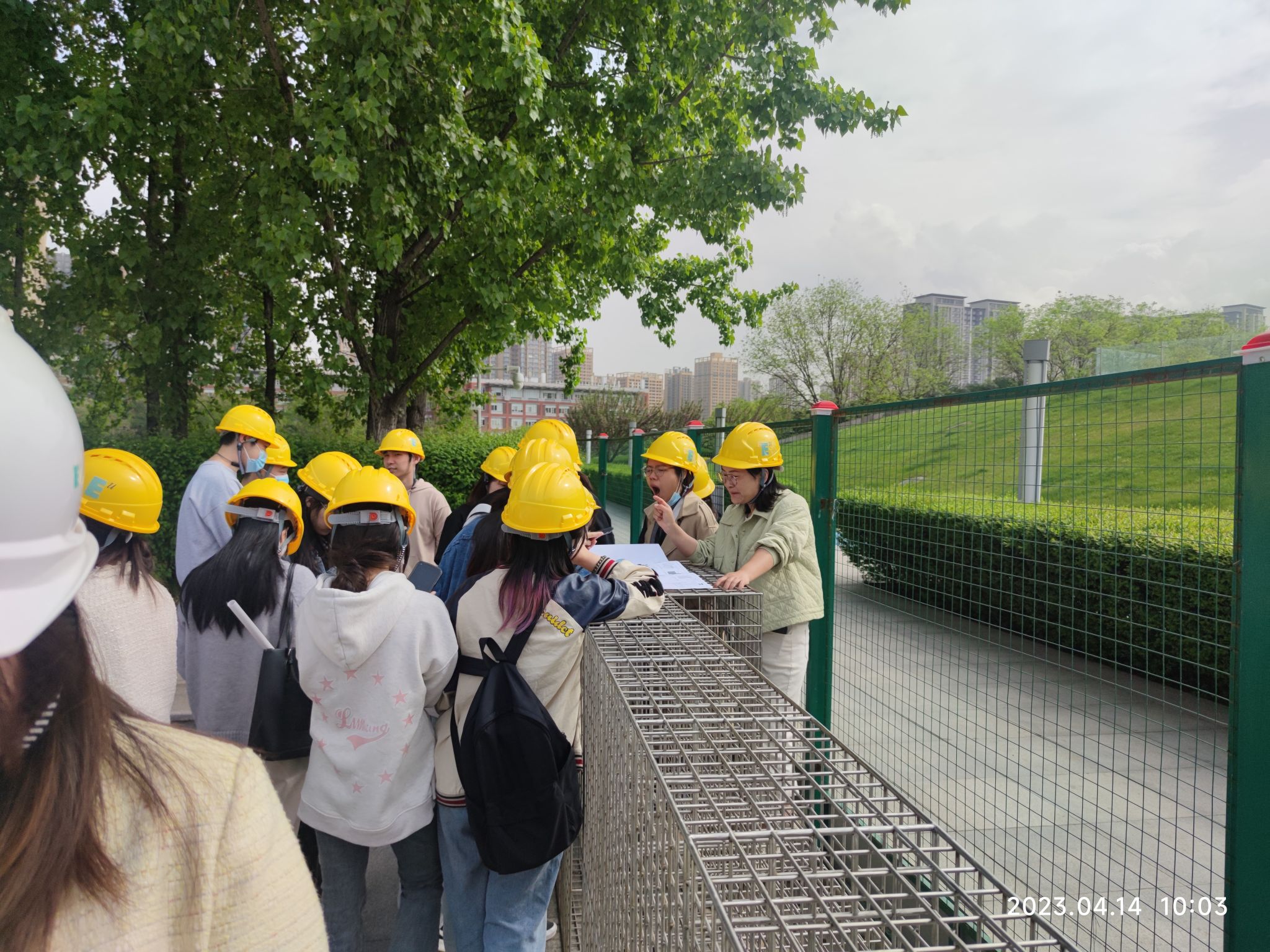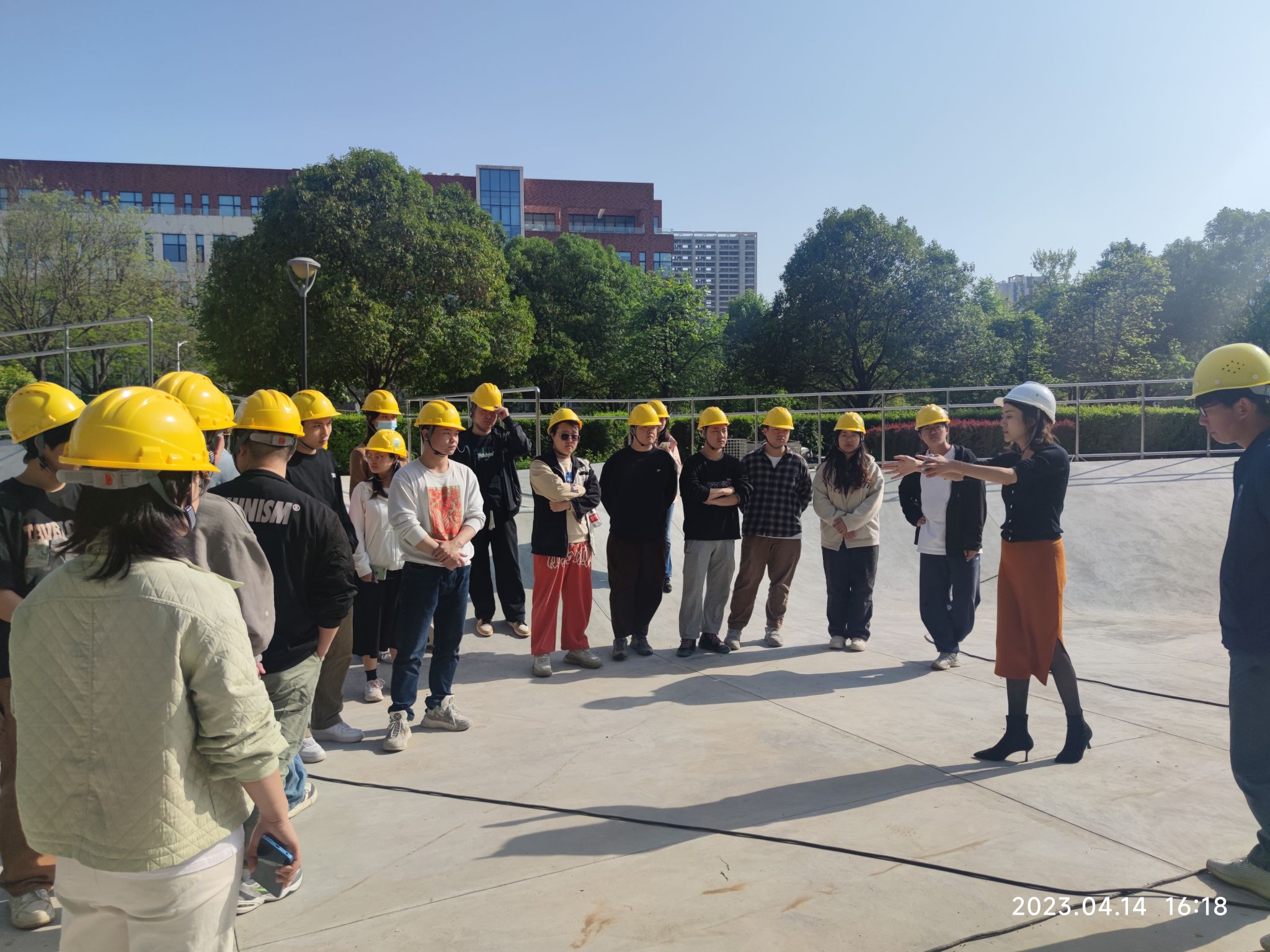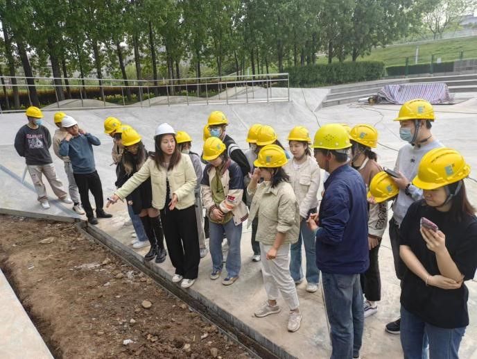 2023年4月15日,在滑板广场项目现场,艾德艺术设计学院耿暖暖老师为材料与工艺课程2020级学生进行实践教学,滑板广场项目组基建处副处长杨海燕、设计管理刘思雨、土建工程师胥云飞、施工单位项目负责人杜青、在项目现场为学生进行实地讲解。