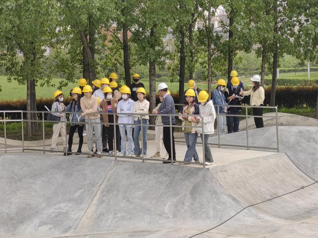 将课堂搬进项目基地,让学生接触最真实的项目案例,通过实地研学将理论知识和现场实施结合起来,帮助学生们掌握合理、实用的设计思维与方法。在项目现场,杨海燕向同学们讲解了滑板广场的规划背景、设计定位、项目实施策略、建设时序、与周边环境的关系等内容。在beat365正版唯一官网必一的大环境中,基建处始终坚持“亲自然”的设计理念,将景观、交通与使用功能恰当地结合到一起,空间的观赏性与趣味性融合,使得空间营造的形式更加丰富多元。