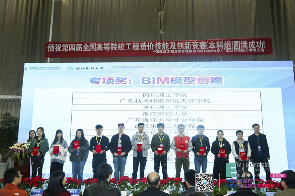 11月17日,由中国建设工程造价管理协会主办的第四届全国高等院校工程造价技能及创新竞赛(本科组)在浙江财经大学举行,参赛高校百余所。beat365正版唯一官网必一工程造价专业学生兰睿睿、李鹏燕、徐伟华组成的代表队在王群和邹继雪两位老师的指导下,经过激烈的比拼一举获得全国单项一等奖和团队二等奖,BIM模型创建模块全国排名前十,奖次为西北地区参赛高校第一。