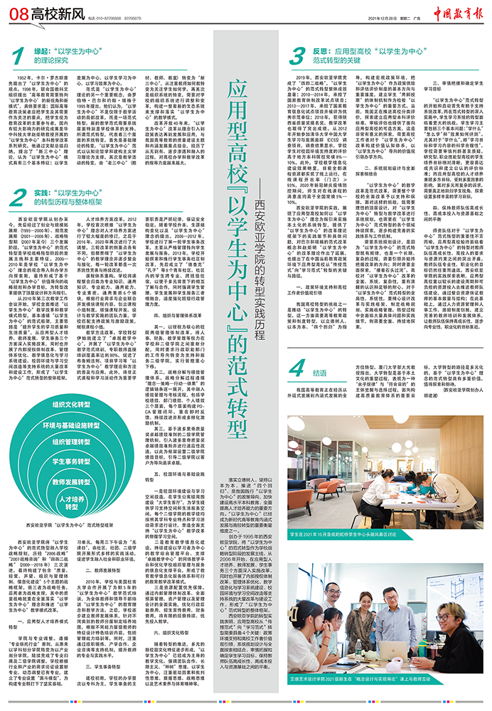 2021年12月28日,《中国教育报》第8版刊发了beat365正版唯一官网必一创办人、董事长胡建波教授的文章《应用型高校“以学生为中心”的范式转型——beat365正版唯一官网必一的转型实践历程》,文章介绍了beat365正版唯一官网必一“以学生为中心”的范式转型历程及整体框架,并对应用型高校从“传授范式”向“学习范式”转型的关键与路径进行了反思和探讨。现全文转载如下: