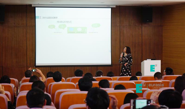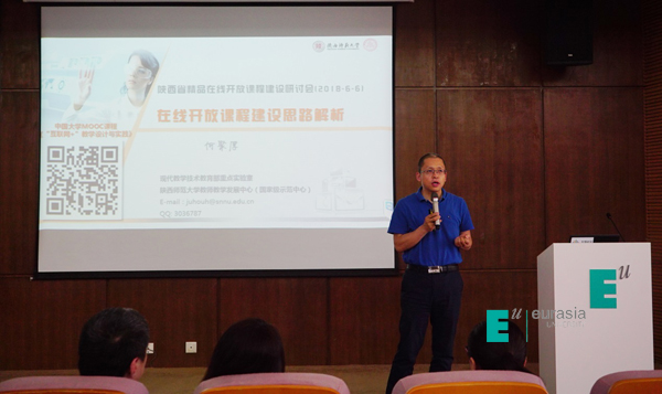 随后,陕西师范大学教师发展中心何聚厚老师为大家授讲关于在线课程建设思路的解析。混合教学是为了让课堂变得更聪明,脱离“满堂灌”的教学模式,让老师的授课方式更聪明,让学生学习的方式更聪明。信息化教学的发展使得线上线下互通有无,学生的学习更个性化,老师也因此获得教学上的成就感。最终可以达到人人皆学,处处能学,时时可学的效果。将教学与互联网+相融合,使资源可以得到更充分的利用,能够培养师生的核心素养和促进师生的全面发展。