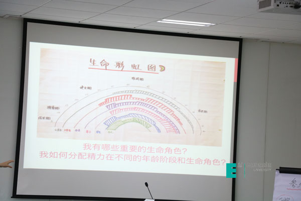 李越老师引入了生命彩虹图,通过让大家规划在不同年龄段应当如何分配精力到各种角色,让学员们明白生涯发展阶段与生命角色彼此间的相互影响,以及在职业生涯的成长期、探索期、建立期、维持期、卸任期等不同阶段处理好生活与工作平衡的关键点。