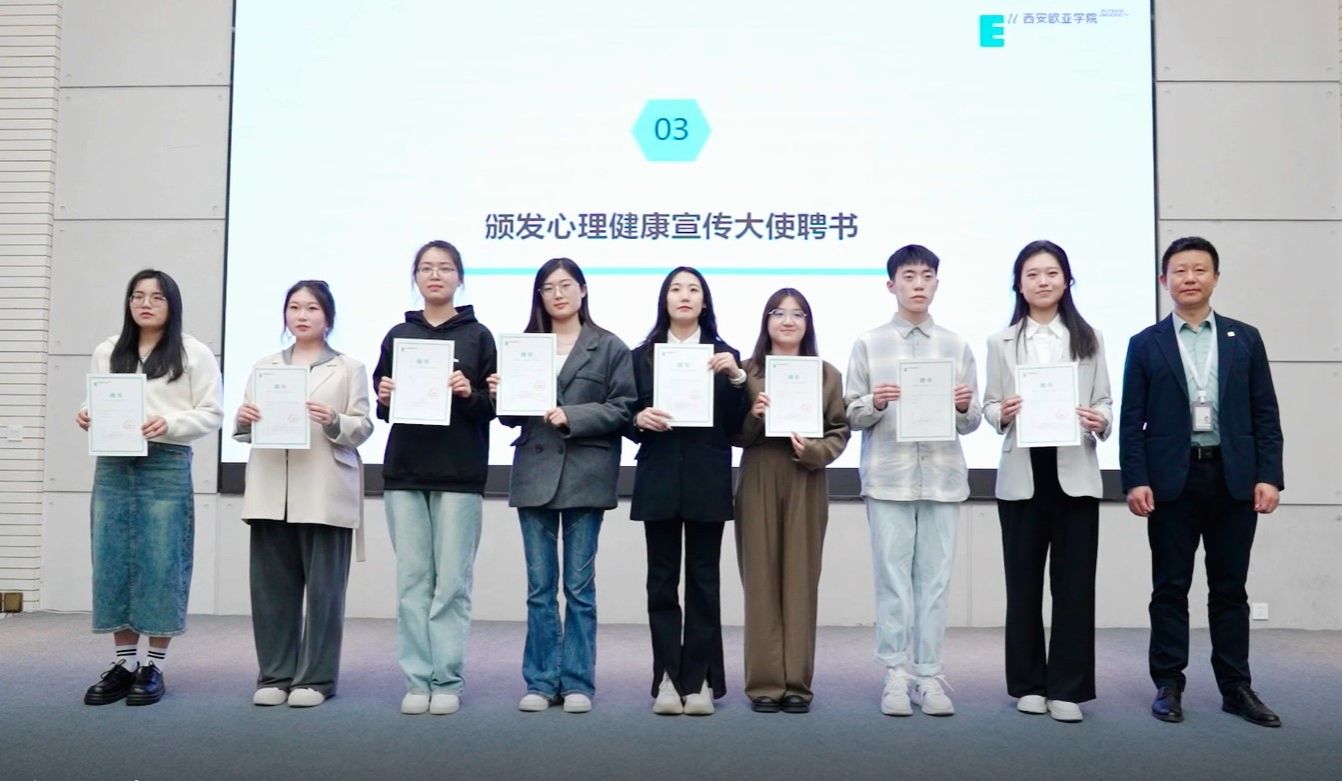 学生发展处处长董杨为来自孔子青年社区的蒋宜申等8名优秀的心理委员颁发了心理健康宣传大使的聘书。