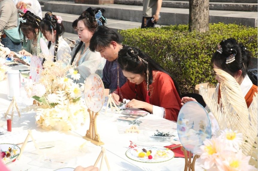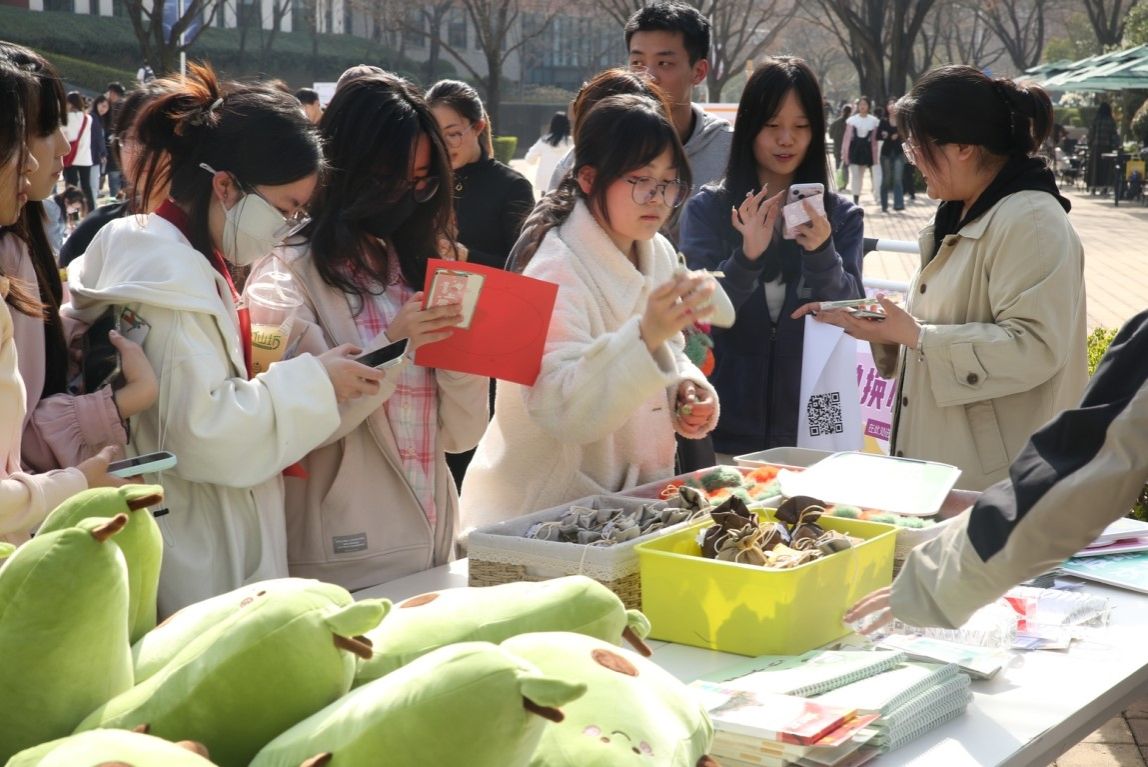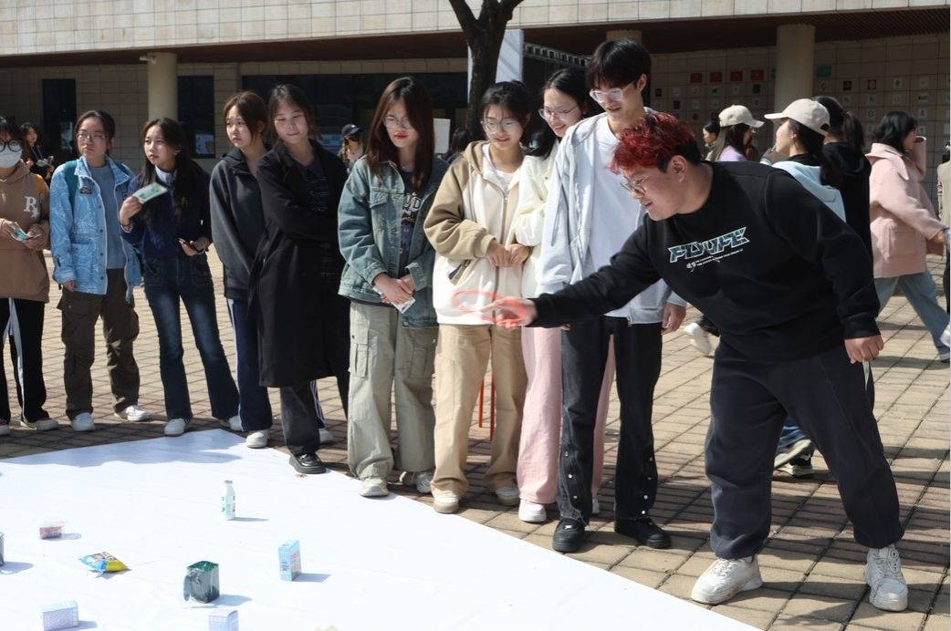 在活动中心南广场,学生心理咨询中心、乐乎二级心理辅导站、I²二级心理辅导站联合承办了系列的户外现场实践体验活动。活动涵盖永生花团扇制作、“微笑传递”现场互动体验等6个项目,参与师生累计1000余人次。