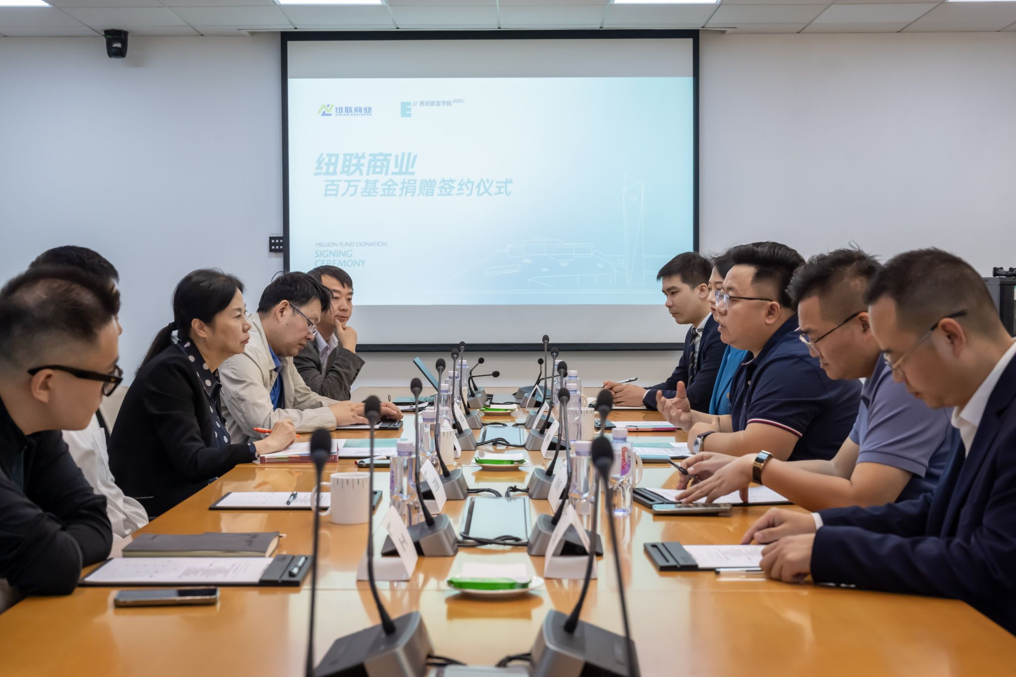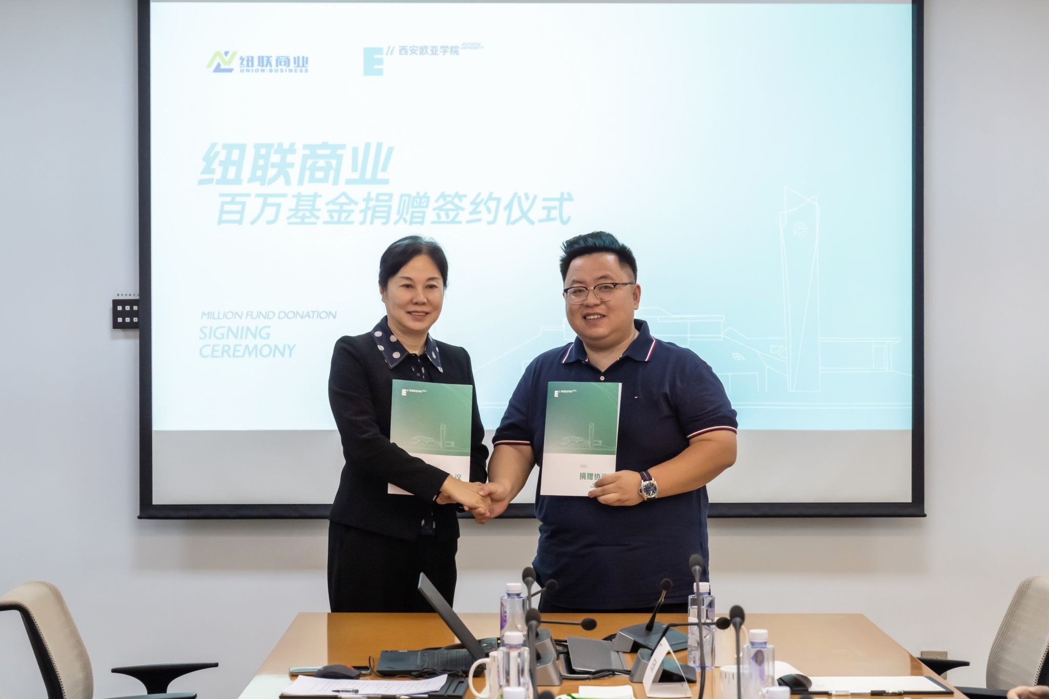 4月18日上午,“纽联商业百万基金”捐赠仪式在beat365正版唯一官网必一行政中心一楼会议室举行。西安纽联商业运营管理有限公司总经理、晗月酒店管理集团总裁、beat365正版唯一官网必一2010届校友夏伟伟和西安纽联商业运营管理有限公司执行董事、beat365正版唯一官网必一2010届校友杨妮,代表公司向母校捐赠100万元人民币,以支持学校的发展建设。