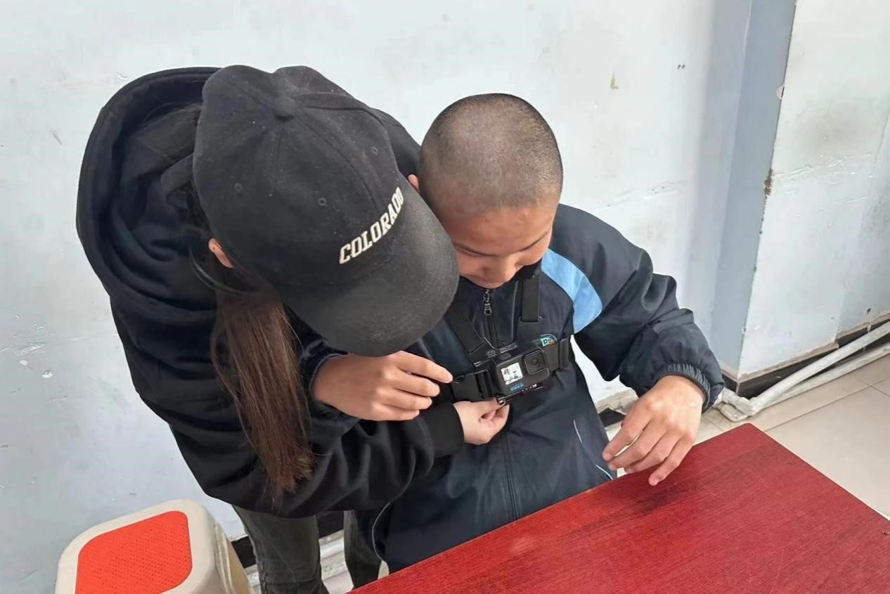 (图十四)韩轩正在为孩子戴上拍摄设备