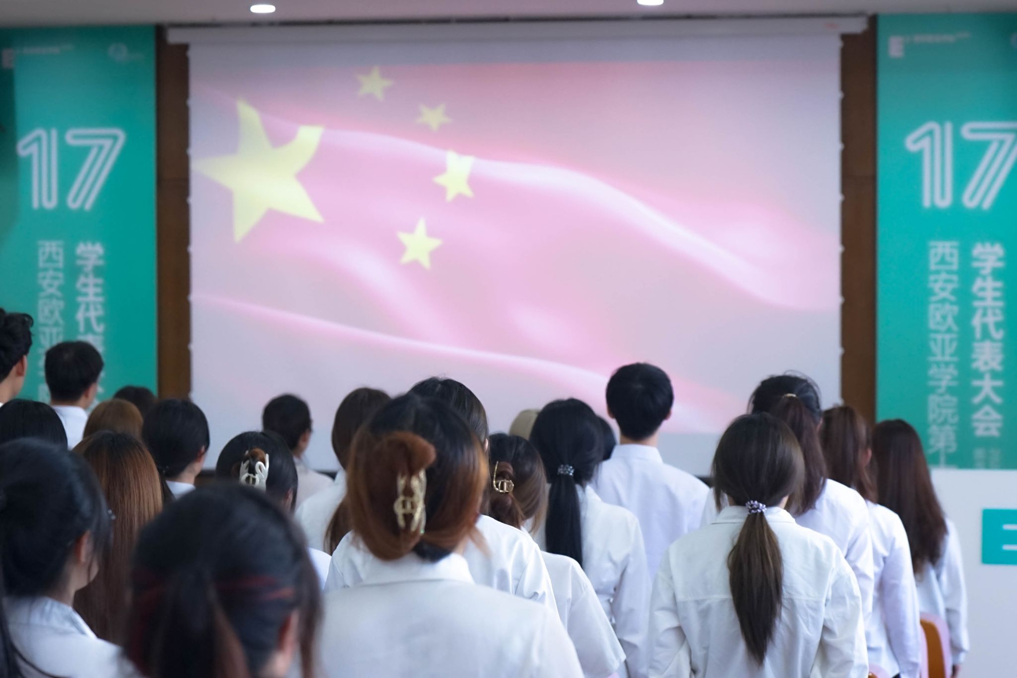 大会开始,全体起立,奏唱中华人民共和国国歌,大会在国歌声中拉开了序幕。
