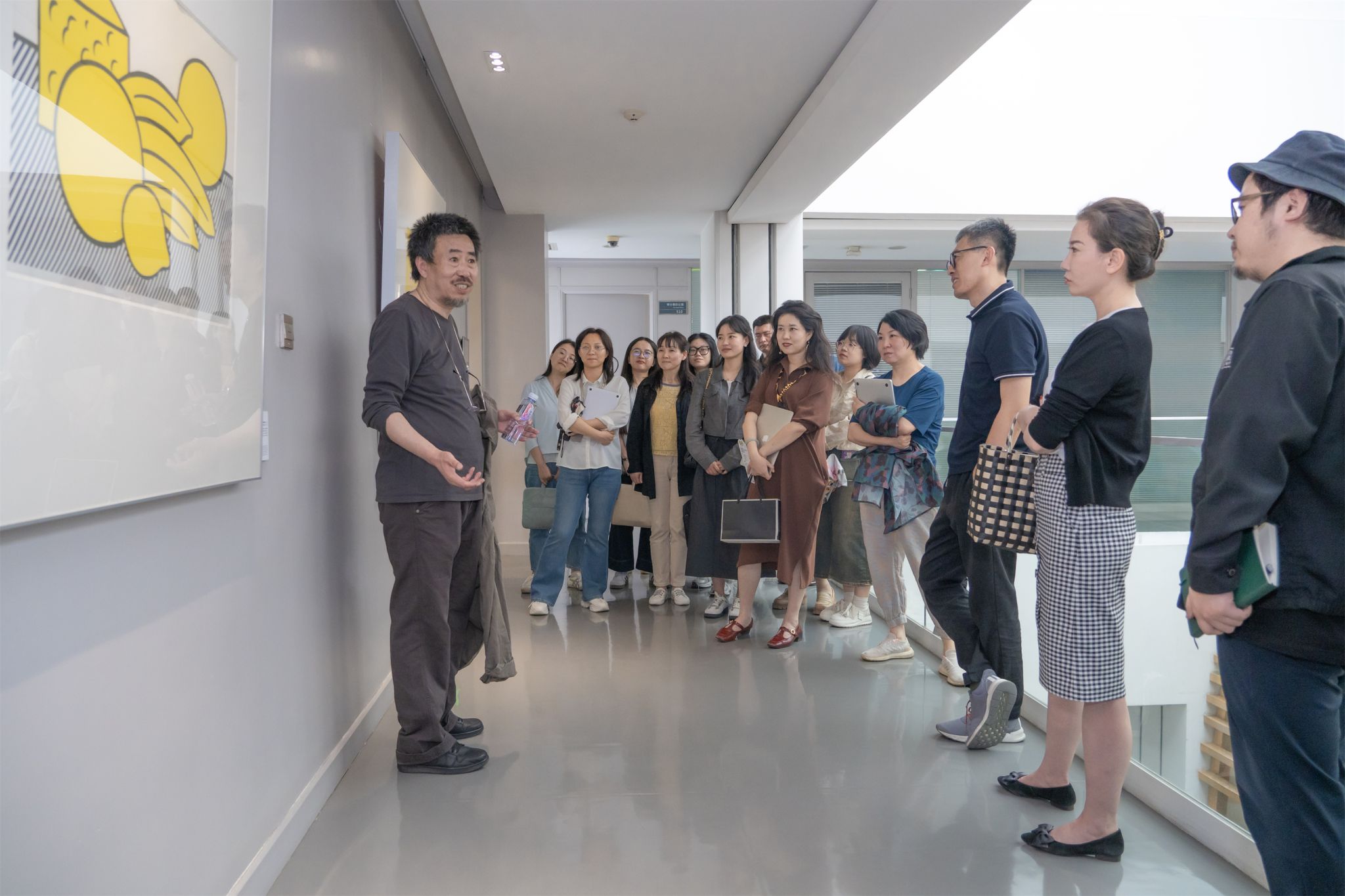 讲座结束后,苏中秋带领师生们在行政中心走廊开启别开生面的艺术探索之旅。行政楼内,光线柔和而均匀,安静而庄重,一幅幅画作悬挂在墙上,如同静谧的守护者。面对由鲜艳色彩和不规则线条构成的画作,苏中秋介绍,这幅画通过抽象的元素和色彩表达了一种自由奔放的情感,同时也探讨了艺术与现实之间的关系,画家通过细腻的笔触和丰富的色彩,将人物的情感和内心世界展现得淋漓尽致。