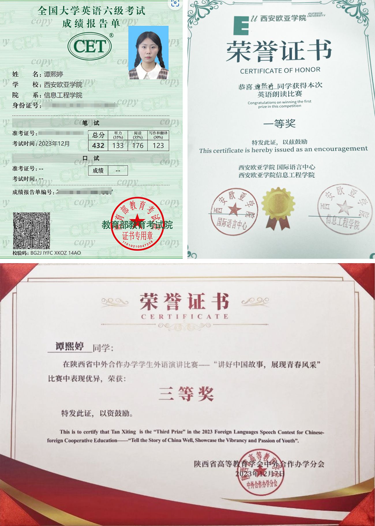 在自身的努力和老师的鼓励下,谭熙婷参加了诸多证书考试与学科竞赛并取得良好成绩