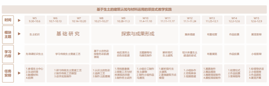 实践项目:每队以“传统工艺模型”/“生土肌理画”/“生土圆柱试件”/“生土马赛克拼贴”/“生土器物”为题,以“生土”为原料,以“夯”为技法,开展建筑实践并按照要求交付作品;