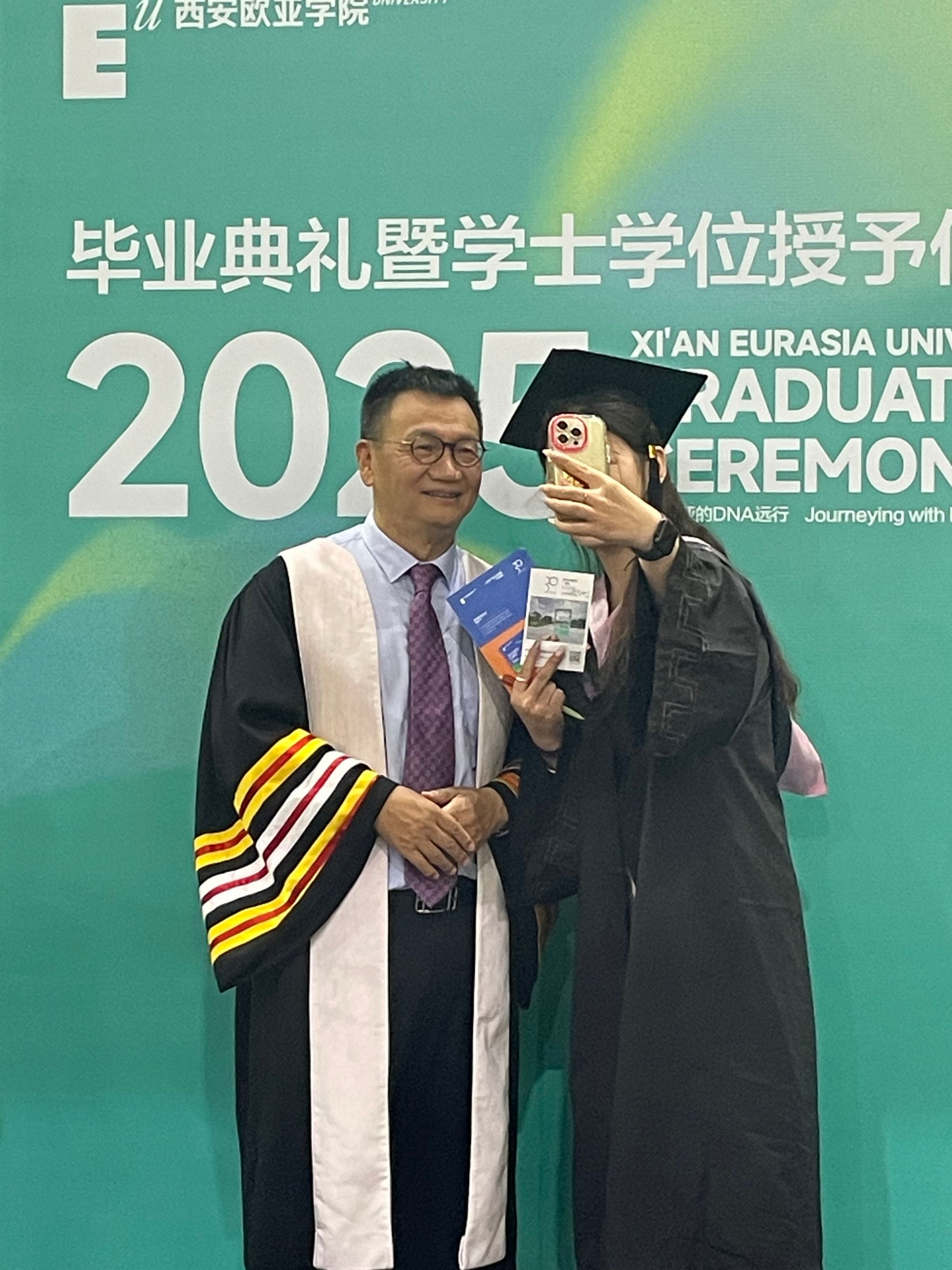 在随后的拨穗环节,温馨感人的互动场景接连上演。当毕业生们身着学士服,满怀感恩之情走上前时,部分毕业生特意停下脚步,向胡建波董事长分享对问卷项目的感受。一位毕业生激动地说:“感谢学校给我们学生一个表达的机会,我特别珍惜,特别认真地填写了问卷,希望学校能越来越好。” 质朴的话语,饱含着对母校的眷恋与期待。那一字一句间流淌的真挚情感,不仅叩击着在场每一个人的心门,更让我们项目组深刻意识到,这份调查承载的不仅是意见的收集,更是无数欧亚学子对母校未来的深情托付。