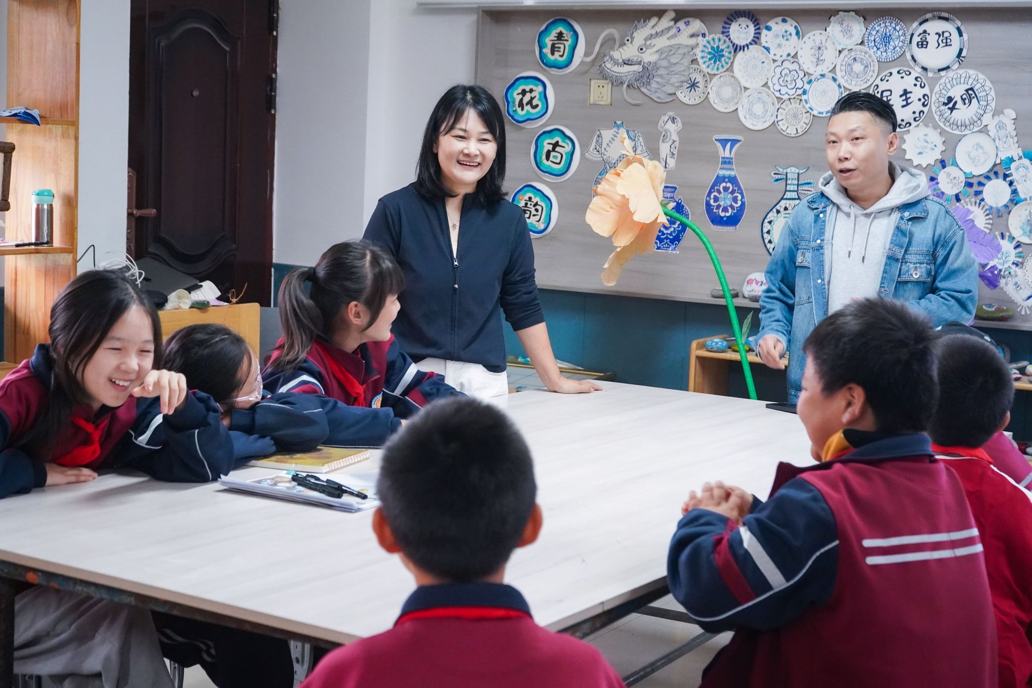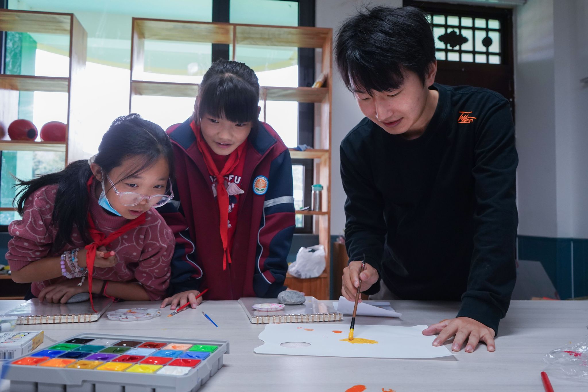 9月22日,在牛家湾小学教育环境设计与改造项目完满竣工之际,项目师生团队为孩子们准备了美术文具礼物,公益艺术课“石头上的艺术魔法”也随即开展。该课程由耿暖暖、徐娜及行业教师张伟共同指导,参与环境设计与改造项目的实习学生辅助教学,将校园环境中的“石文化”主题延伸至动态课堂,有效激发了学生的艺术兴趣与创造力,实现了美育对童心的深层浸润。