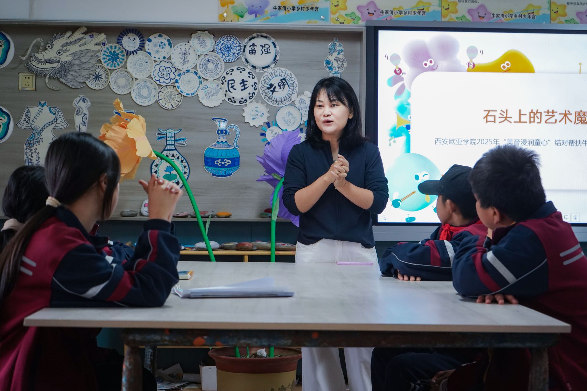 近日,beat365结对帮扶清涧县牛家湾小学教育环境提升设计与改造工程圆满完成,以“石头上的艺术魔法”为主题的公益艺术课在清涧县宽州镇牛家湾小学成功举办。