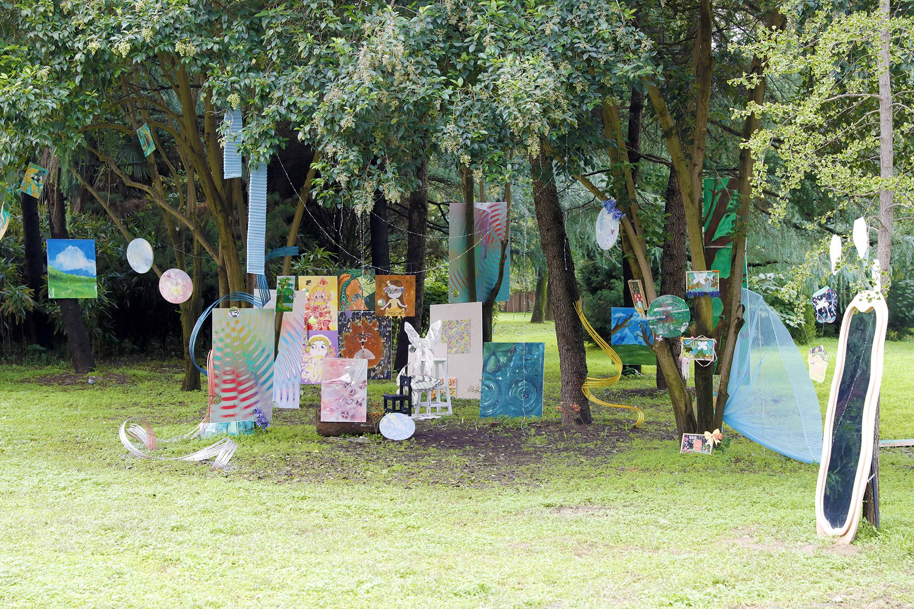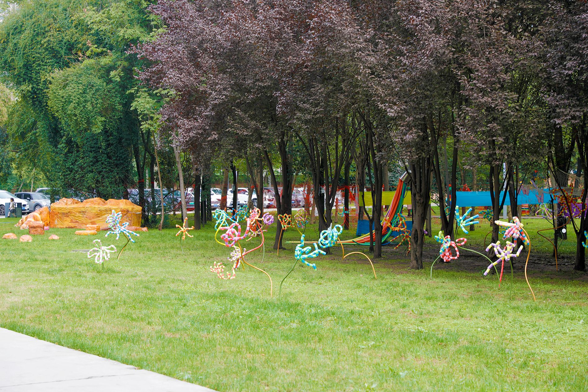 其中,校外参展单位的作品呈现了对儿童艺术教育的深刻理解和多元探索。大家集体共创的涂鸦长廊,以自由挥洒的集体创作,开启了一场关于色彩与想象的狂欢。不知艺术学院带来的光之穹顶”“Hi”“穿林之所”3件作品,分别以轻盈材质构筑冥想空间,以生动手势连接人与自然,以廊道引导沉浸体验,启发观者多维度探索艺术与场域的关系。唐门艺术12名孩子创作的破茧之屋作品,在草坪上搭建起一座60多平米的兼具美感与温度的破茧蜕变之所,让孩童对自然的奇思妙想有了具象载体。LE8 ART和斑斓绘本美术共同呈现的甜蜜的草坪作品充分激发味蕾,孩子们亲手绘制的金黄面包错落点缀于草坪,创造出独特的通感体验。彩色树儿童美育工作室创作的呼吸 水源 循环作品,让孩子们能够更加直观地理解生态循环的奥秘。