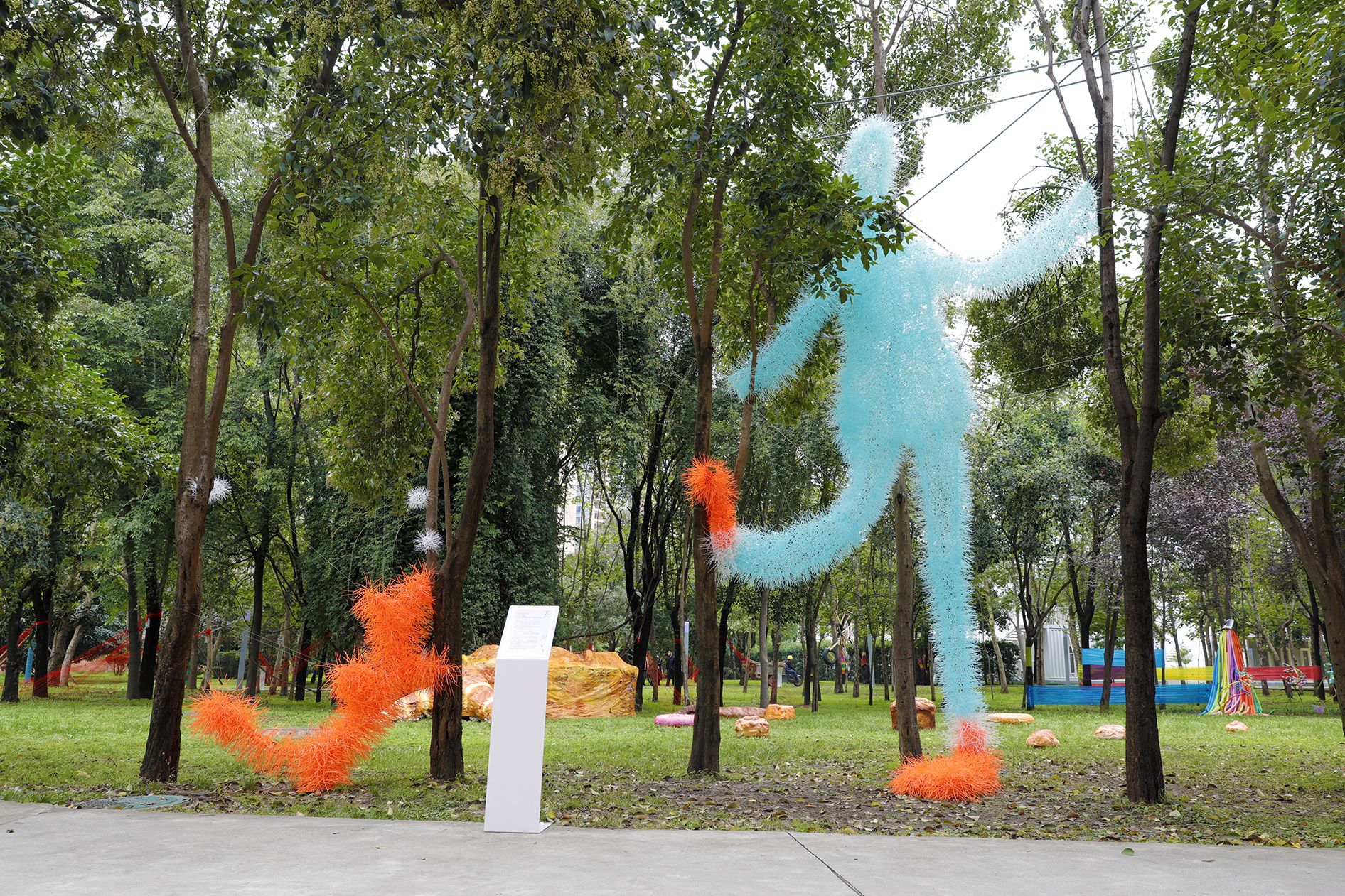 同时,人文教育学院师生极具分量的专业创作,也吸引了观众们的驻足和交流互动。儿童视觉艺术实验班的同学们以300组石膏雕塑,展开关于成长的哲学凝视。教育学专业(儿童视觉艺术教育方向)的学生则分别运用3吨青石板构筑起螺旋石阵,在厚重与流动间诠释人与自然的关系;用3000支光感花束演绎时光色彩,隐喻生命的个性绽放;用30000根工业扎带编织爬树巨人飞翔小狗,将标准化工业材料转化为有机生命形态,探讨工业文明与自然的共生关系。儿童视觉艺术实验班、LE8 ART联合共创的童趣生态的想象构筑,直面树林与工地交界的特殊场域,探索人造基础设施向自然生命的温柔回归。