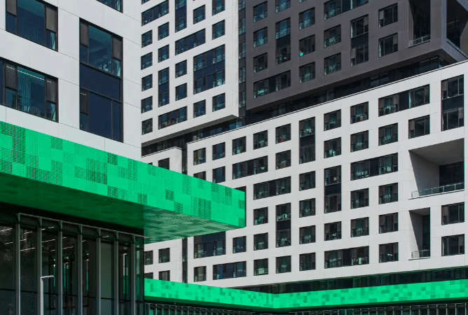 走近春山里,极具雕塑感的建筑形态引人注目,灰白色系墙面构成沉稳背景,跳跃的开窗尺度与色彩点缀其间,面向主校园的东立面,变化丰富的阳台造型令人联想到蒙德里安的构成艺术