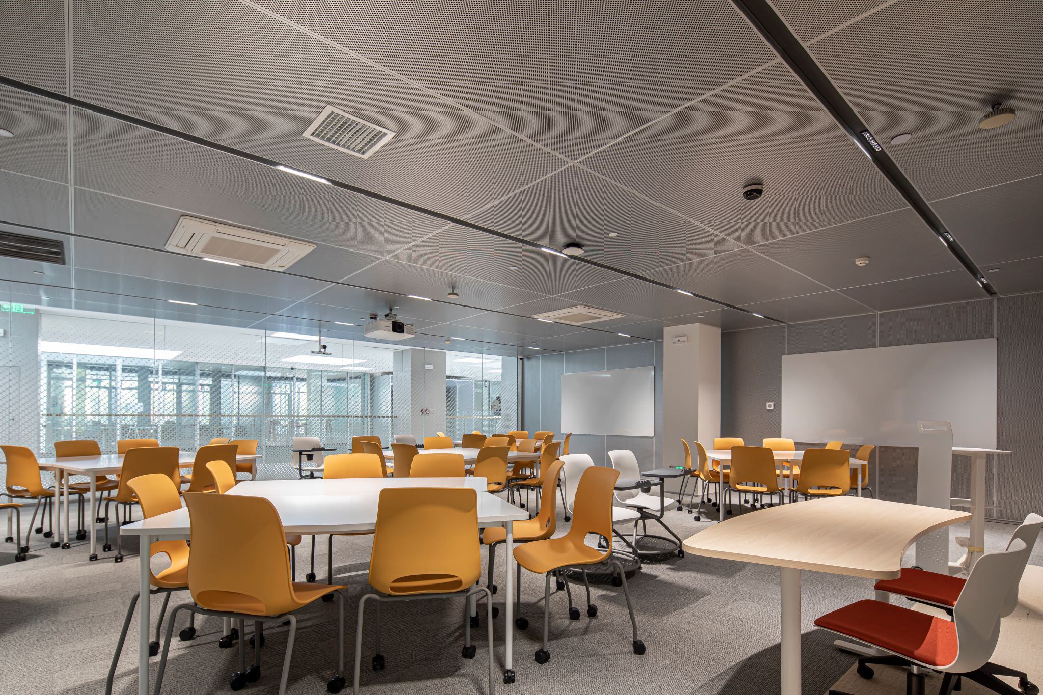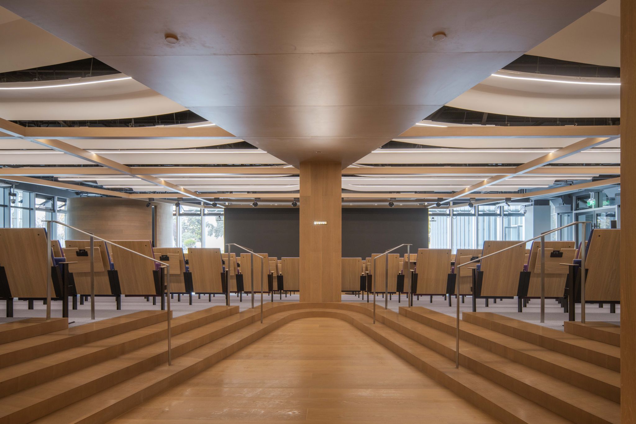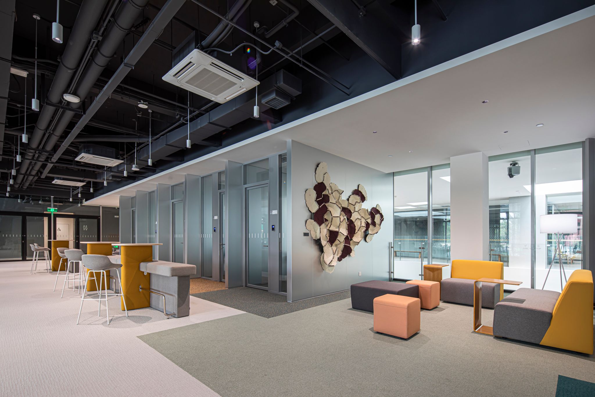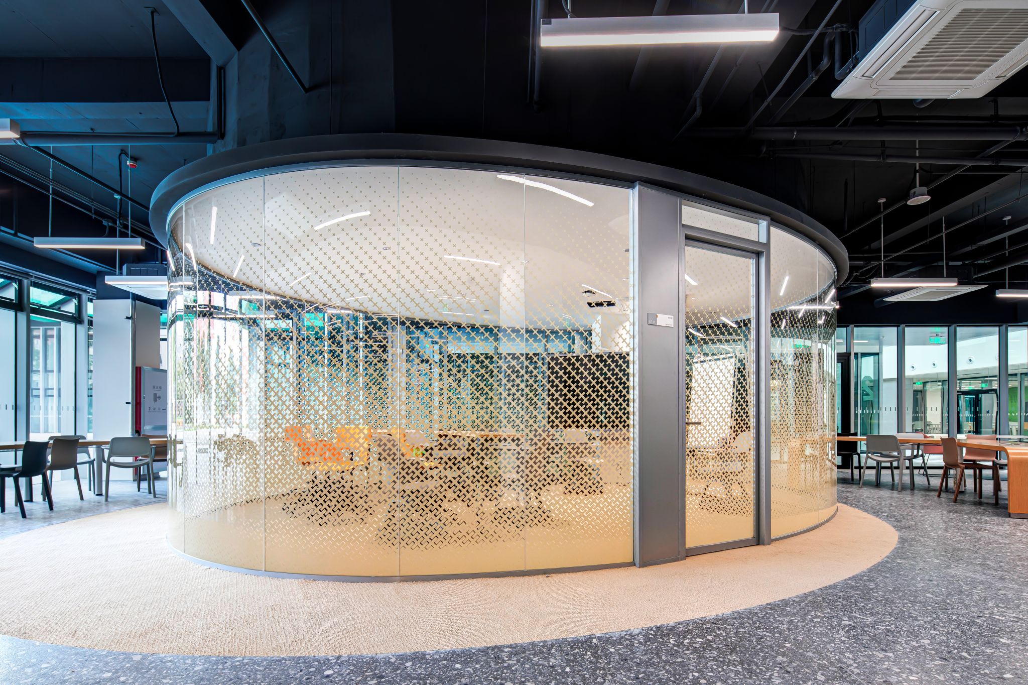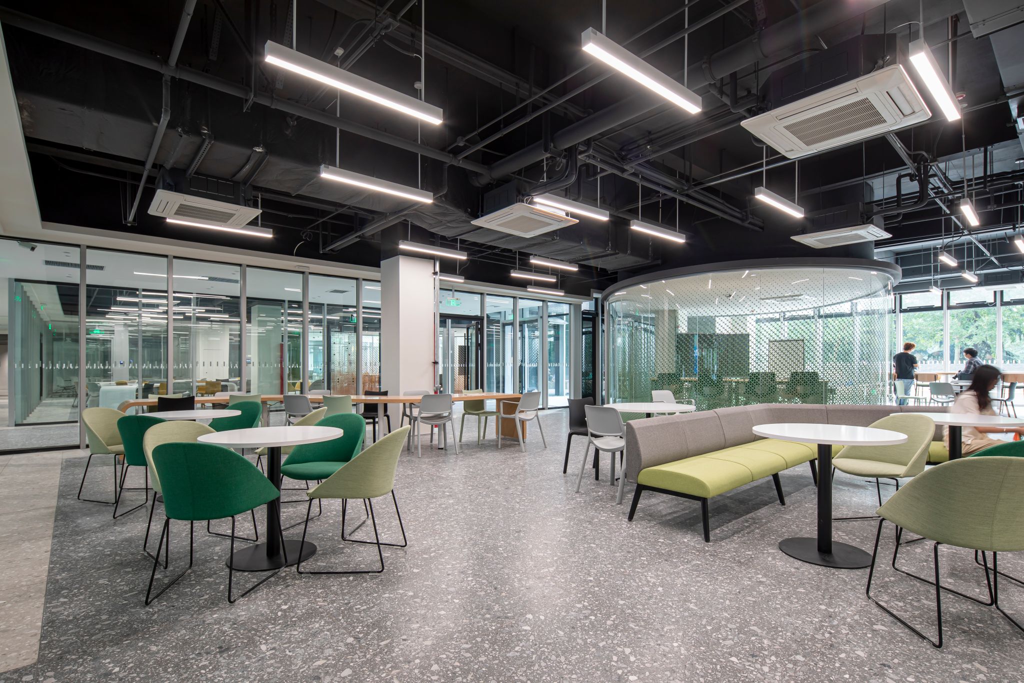 裙楼内部设有泡泡空间(圆形教室)、鼓励自由交流的非正式学习区、公共讨论区、校企合作会议室、兼具休闲与展览功能的复合空间、以及充满社交氛围的咖啡厅等,讲座、展览、艺术品展陈等活动也将在这里发生,激发即兴的交流与碰撞。