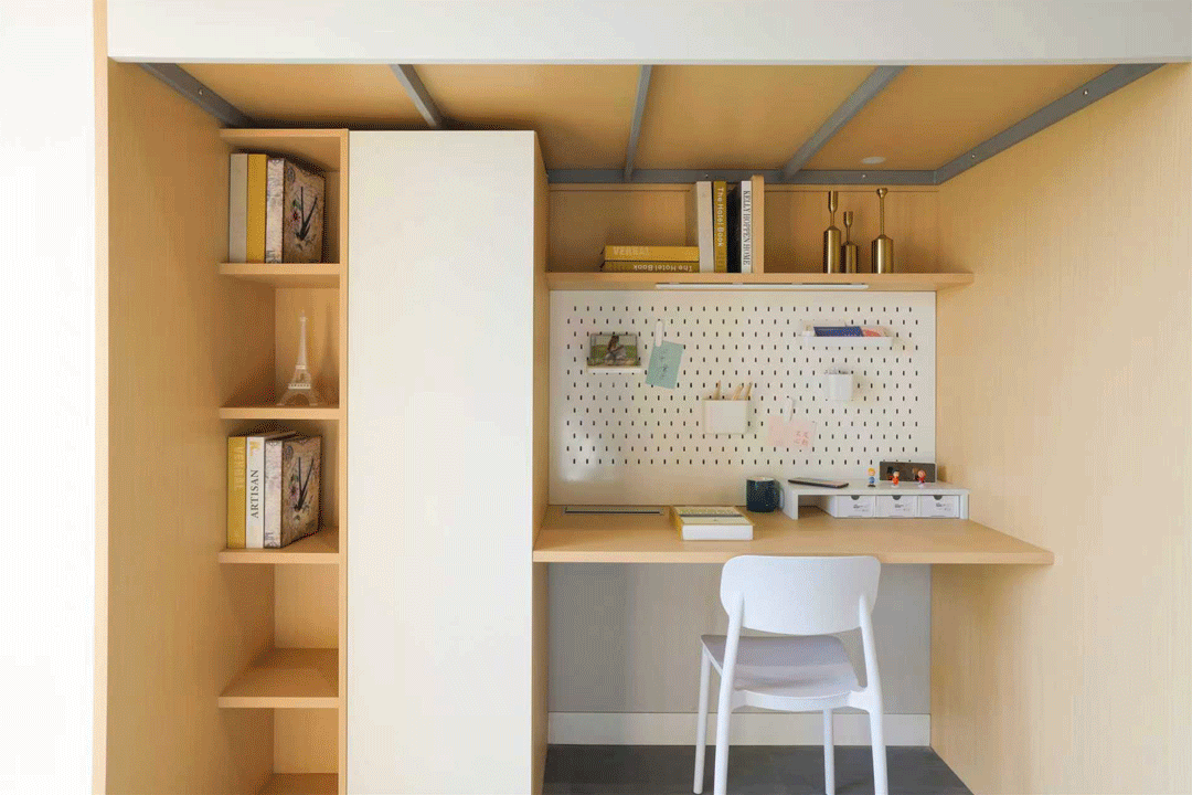 校方对学生需求的重视,更体现在一些关乎日常使用体验的细微之处。老师们通过调研发现,00后在人际交往中更注重边界感、关注自我空间。为此,他们提前为每张床安装了方便悬挂床帘的轨道;两张床之间的隔断并非全封闭,而是特意留有一扇小窗,既保障个人隐私,也保留沟通渠道;提供了符合阅读照明亮度和角度的阅读灯;每张书桌旁增加洞洞板,方便个性化收纳。