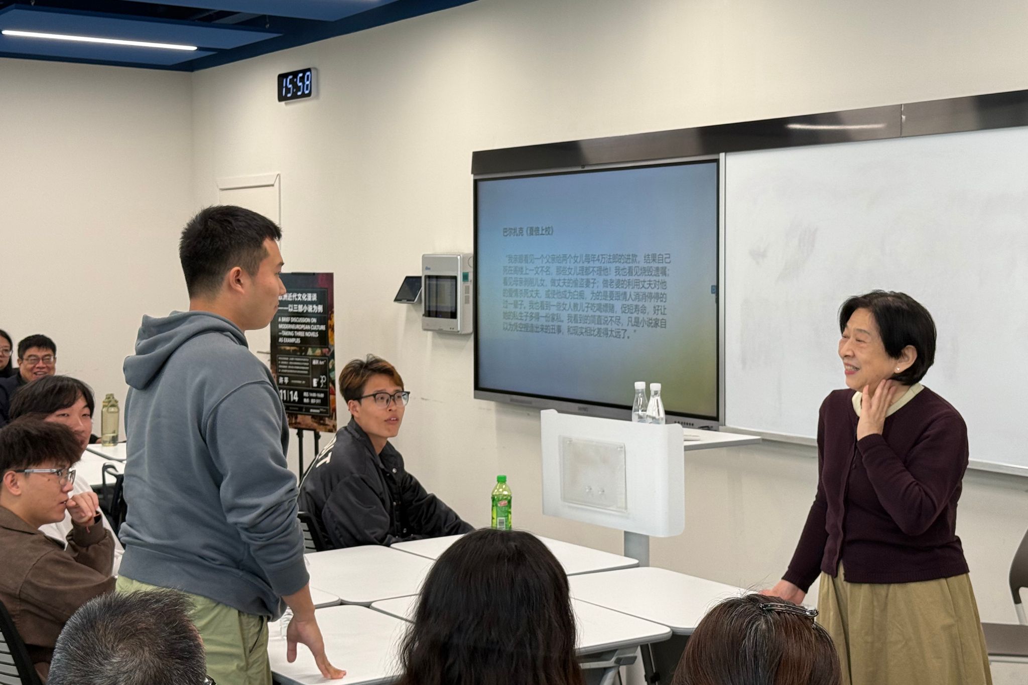 讲座中,吴春相系统阐述了汉语的多元美学维度:其简洁美体现于一字一音一义,表达效率高,信息密度大;音乐美源于声调变化、平仄交替、节奏韵律,构成独特的听觉美感;匀称美可见于对偶、对联、回文、回文等形式,注重结构上的平衡与和谐;建筑美则展现在文本的时空结构中。他还特别引用浙江大学吴洁敏教授提出的《京华烟云》与《瞬息京华》译名之争为例,谈到汉语的音韵美感在跨文化传播中的重要性。“85%的受访者认为‘京华烟云’比‘瞬息京华’更好听,这不仅是对音韵的敏感,更是对文化气质的共鸣。”