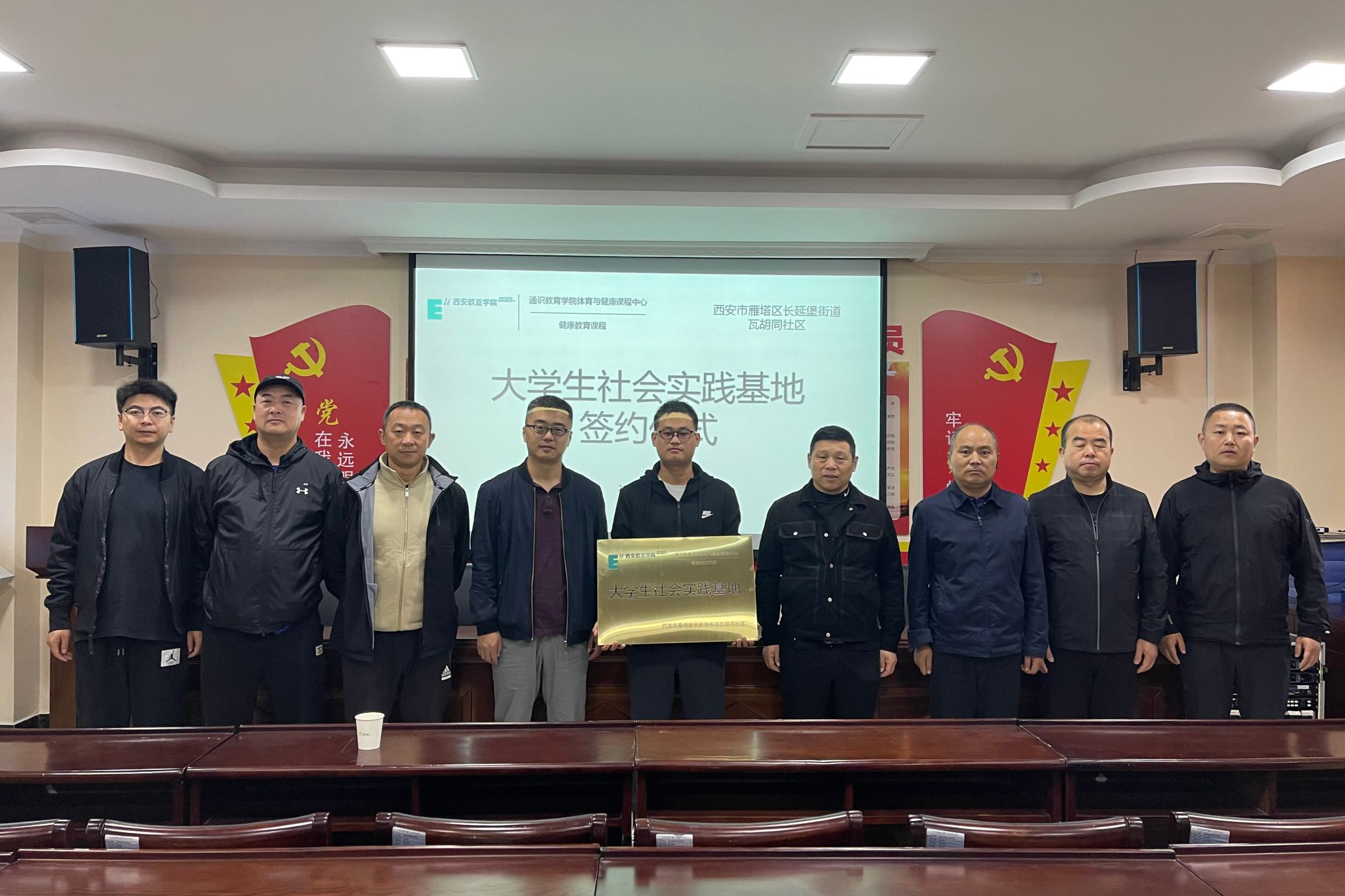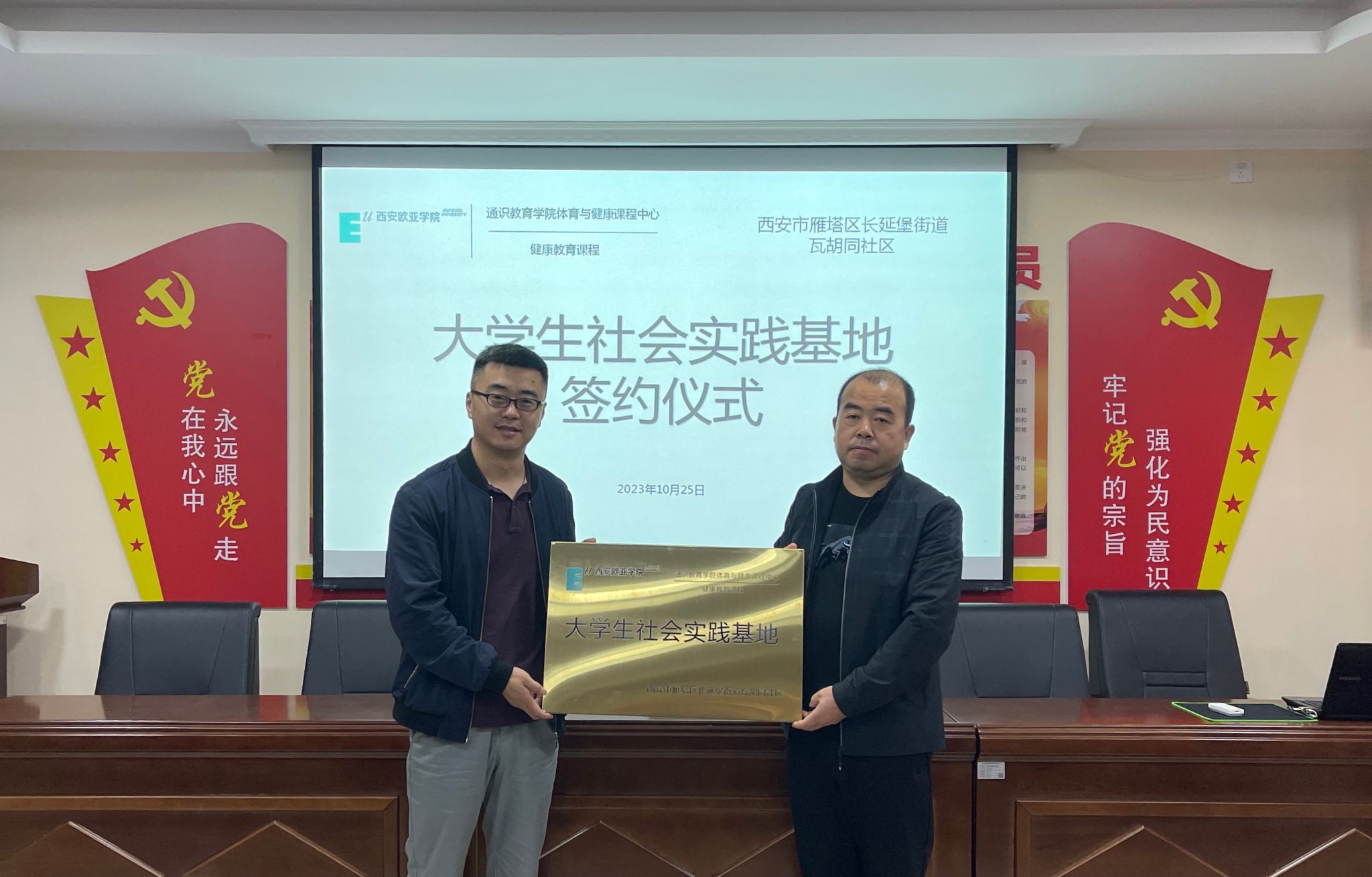 2023年10月25日,beat365通识教育学院体育与健康课程中心与西安市雁塔区瓦胡同社区举行校地合作座谈会,双方就共建大学生社会实践基地签署合作协议并举行挂牌仪式。瓦胡同社区党委书记崔小文、党委副书记崔延安、委员王宏伟、王盼,beat365通识教育学院院长助理段永刚、体育与健康课程中心副主任高鹏等出席签约仪式。