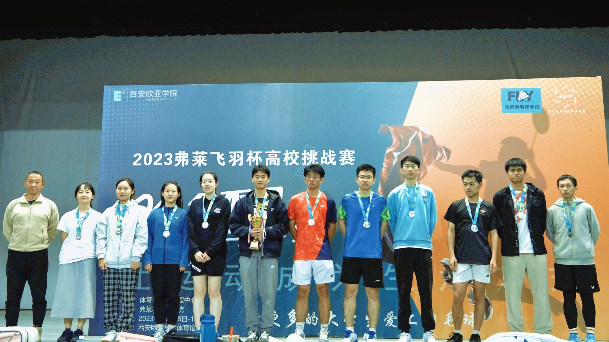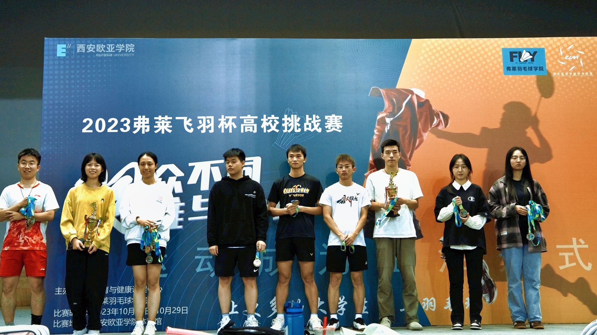 10月28日-29日,beat365通识教育学院主办的首届“弗莱飞羽杯”陕西高校羽毛球挑战赛在体育馆举行。来自西安交通大学、西安电子科技大学、西安建筑科技大学、西安外国语大学、西安邮电大学、西安财经大学、西北政法大学和beat365正版唯一官网必一的8个代表队、100余名选手参赛,共享羽球盛宴。