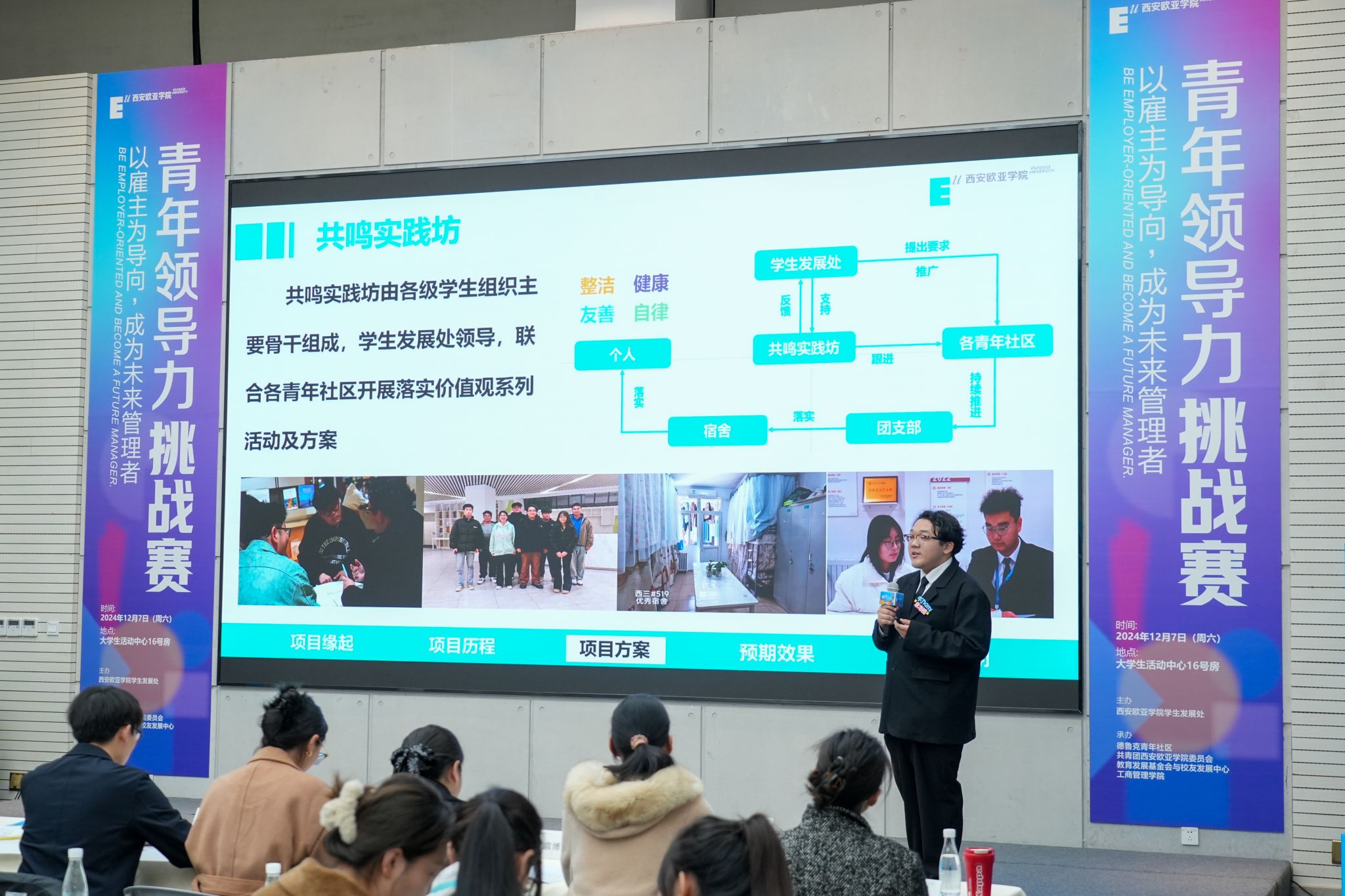 学生团队分别从青年社区共享价值观的实践落地的方案、校友资源的开发与利用方案两个研究课题出发,通过现状分析、实施计划、未来展望等方面,针对各部门面临的实际问题提出有效落地方案。