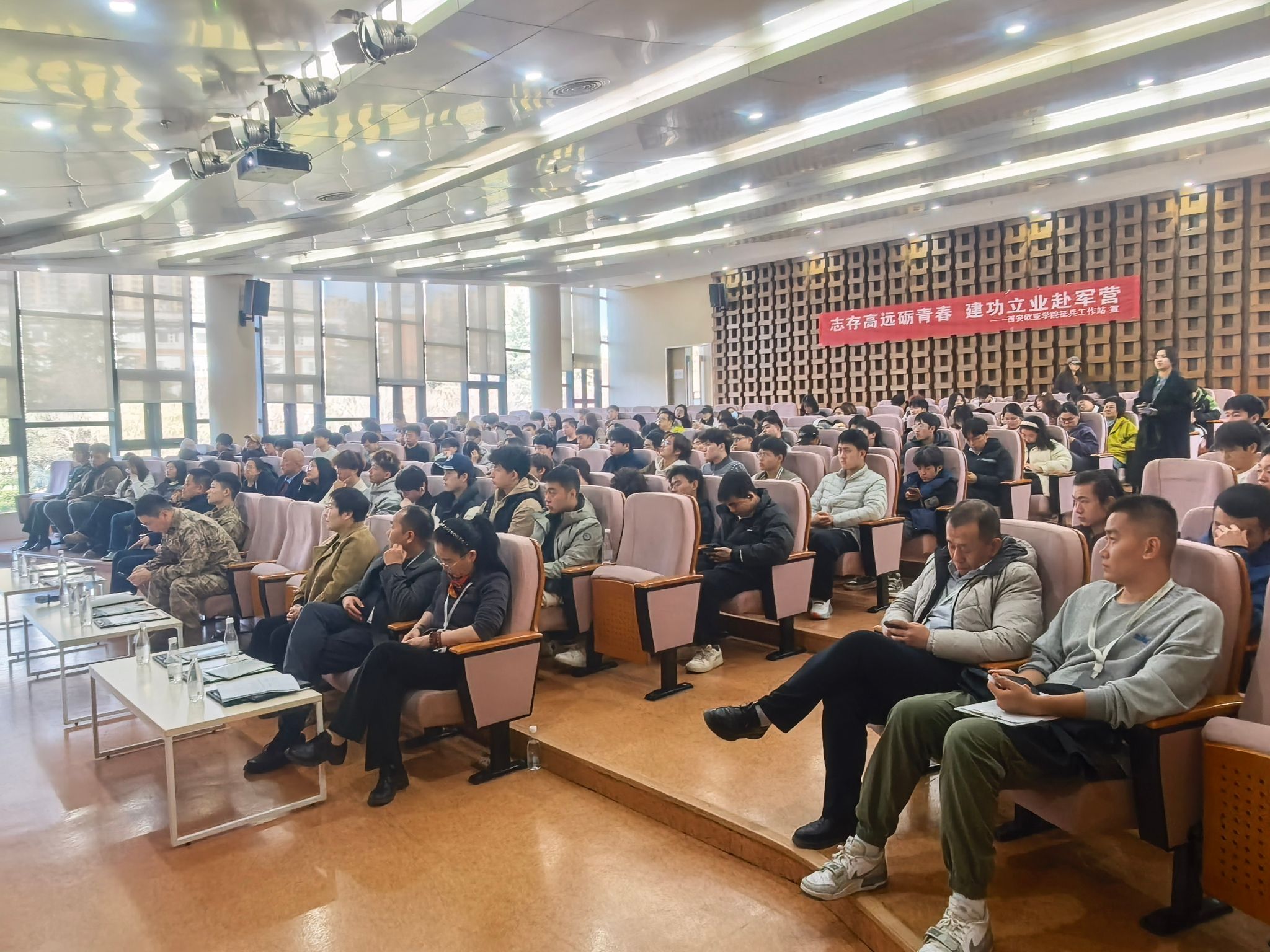 宣讲会由beat3652025年优秀退役复学女兵罗昕雨同学主持。宣讲会现场济济一堂,气氛庄重而热烈。出席活动有西安市雁塔区人民武装部副部长刘洪栋、军事科参谋杨斌;beat365正版唯一官网必一稳定办常务副主任、后勤集团副总经理强建旗、学工部副部长陈劲松、第三分党委书记陈振星、学生事务督导田志刚、学生资助管理中心资助专员郭晓慧、职业发展与企业合作部(DCC)就业专员张鑫桃、beat365正版唯一官网必一征兵工作站站长高奇、副站长李涛、beat365正版唯一官网必一保卫处张亚军老师等职能部门相关领导、各青年社区毕业生辅导员与满怀报国热忱的毕业生代表近260人齐聚一堂,共同聆听来自军营的召唤,现场洋溢着浓厚的家国情怀与昂扬的青春斗志。