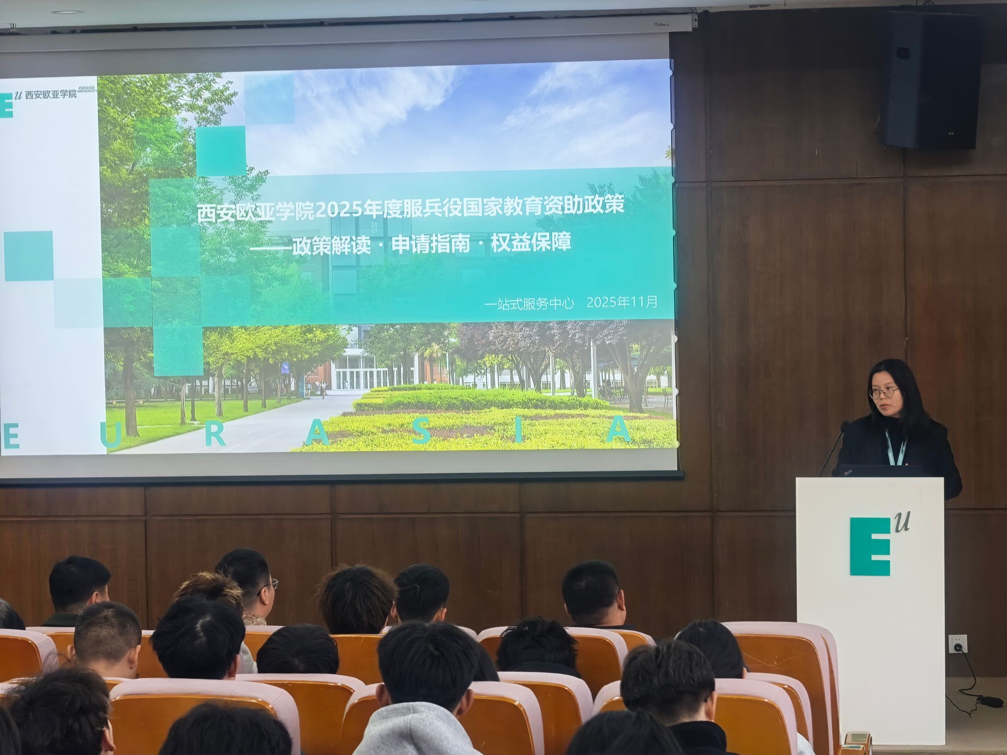 精准的保障是消除后顾之忧的关键。beat365学生资助管理中心专员郭晓慧老师随后登台,聚焦同学们最为关切的学业与经济支持问题,对“服兵役国家教育资助政策”进行了专业细致的解读。她从资助政策的具体内容、申请流程指南到学校的对接部门与资源平台,都做了清晰的说明,学校也将为入伍学生提供“一站式”全流程服务,确保每位有志学子都能“轻装上阵”,安心报国。
