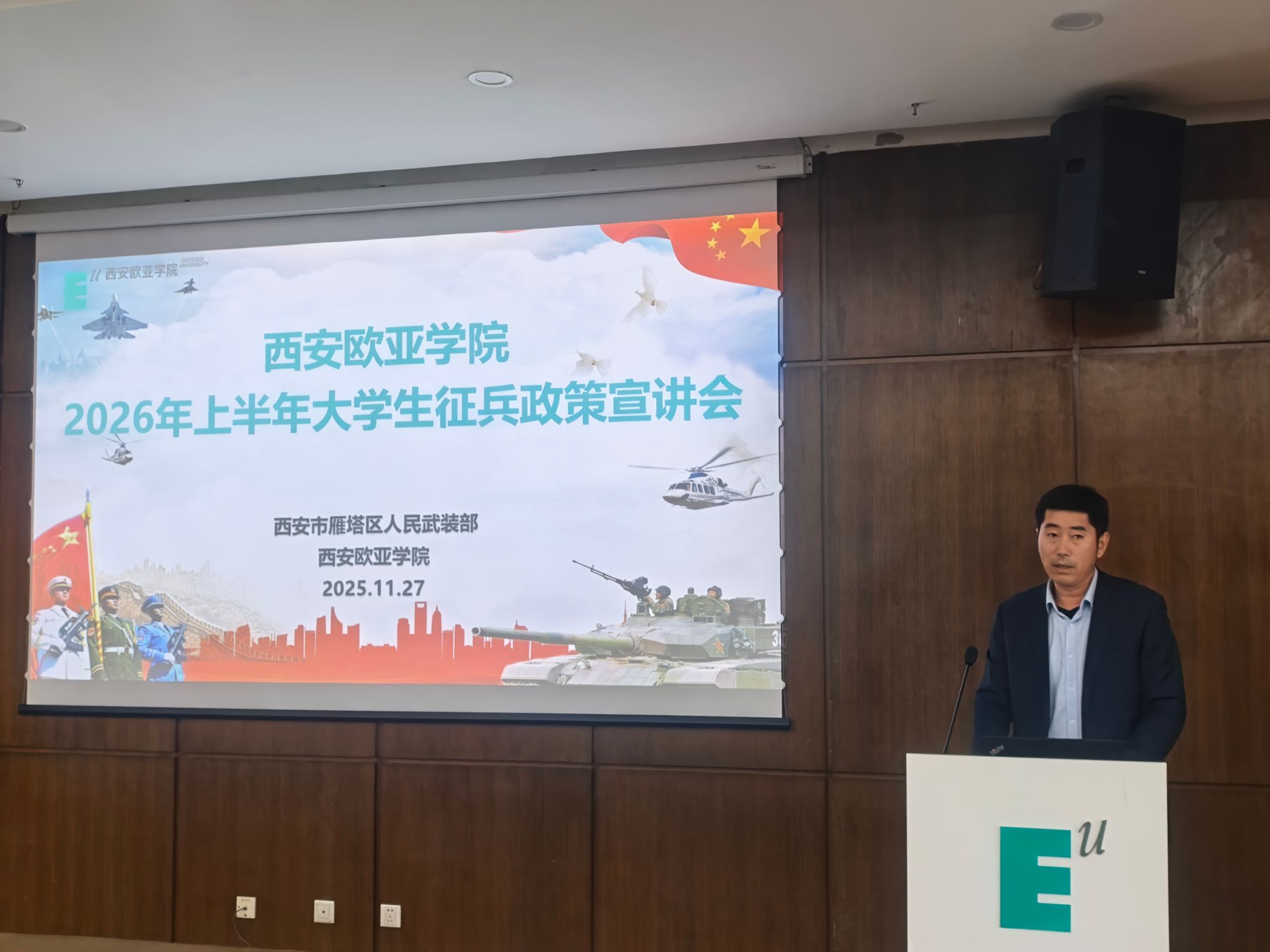 下午2时30分,校稳定办常务副主任强建旗首先代表学校致辞。他站在服务国防和军队现代化建设、落实“为党育人、为国育才”初心使命的战略高度,对雁塔区人武部长期以来给予beat365征兵工作的悉心指导与大力支持表示衷心感谢。在全面回顾和总结beat3652025年征兵工作成效后,他向在场学子发出深情而有力的号召:“强国必先强军,强军必先强兵。人民军队正朝着建成世界一流军队的目标阔步前进,这为有理想、有学识、有担当的大学生提供了施展才华、建功立业的广阔舞台。希望欧亚学子能勇担历史重任,把个人理想融入强军实践,抓住时代机遇,积极应征入伍,让青春在火热的军营中淬炼成钢,让生命在为祖国和人民的奉献中焕发绚丽光彩。
