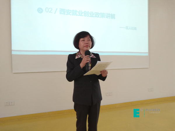 雁塔区人社局田利萍局长为大学生做百万大学生留西安就业创业政策宣讲,从“认识大西安——这里是孕育梦想的摇篮,拥抱大西安——这里是成就梦想的福地,雁塔欢迎你——这里是实现梦想的家园”三个方面宣讲了当前西安、雁塔全方位发展成绩、未来规划和发展前景。田局长指出,雁塔区人社局将为同学们提供最优的服务,建立人才服务专员制度,以“店小二”精神用心用情用力提供超“五星级服务”,为青年学子搭建人生出彩的舞台,全力为大学生就业创业、筑梦圆梦保驾护航。田利萍还向大学生发出诚挚邀请,欢迎大家加入“城市合伙人”, 到雁塔学习生活、施展才华、成就事业。