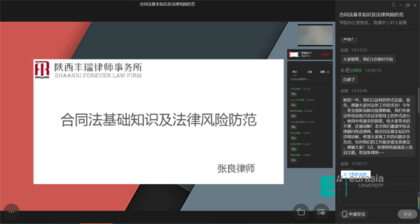 2020年,一场突如其来的疫情席卷全国。为保障法务工作按计划推进,响应学校居家办公的工作要求,3月16日,学校特邀请法律服务团队张良律师,通过平台在线直播的形式,组织开展了以《合同法基础知识及法律风险防范》为主题的法律知识专项培训,提高全校法务专员的业务能力。培训通过主题讲授和互动交流两个部分进行,参训教职员工上线人数达到50余名。