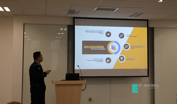 会议的主要培训内容由出入境管理局王慧警官为大家做主要讲解。王警官分别从出入境相关法律法规、外国人来华日常生活注意事项以及重要联络方式三个方面进行了阐述,内容涉及签证办理、居留许可、就业、旅行等方面。