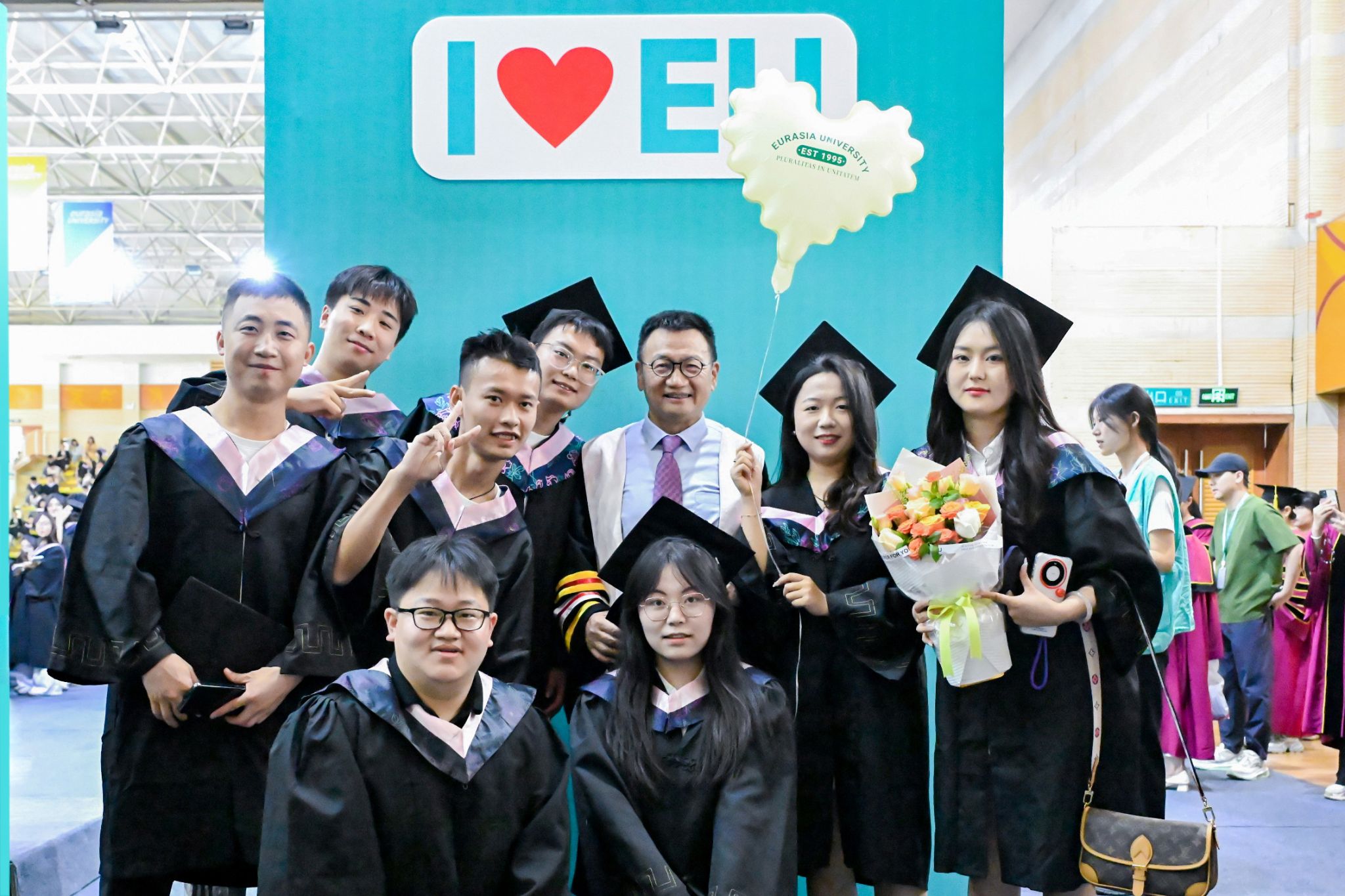 我知道,此刻你们心中必然百感交集:一边是终于“出笼”的兴奋和对未来的憧憬,一边是对同学、室友、社团好友的不舍。还记得当初,我们坚持让不同专业的同学住在一起,要求每个人都加入社团吗?这安排可能添了点“麻烦”,但它最大的好处,就是帮你们打破了专业的“小圈子”,大大拓宽了交友面,让你们从“书斋里的学生”,更快地成为懂得与人相处、懂得团队协作的“社会人”。很多年以后,你可能发现这样的社会交往收获丝毫不亚于你的学习经历。这就是你们喜欢欧亚、爱欧亚的原因:颜值高,有温度,很用心,没爹味。(掌声)
