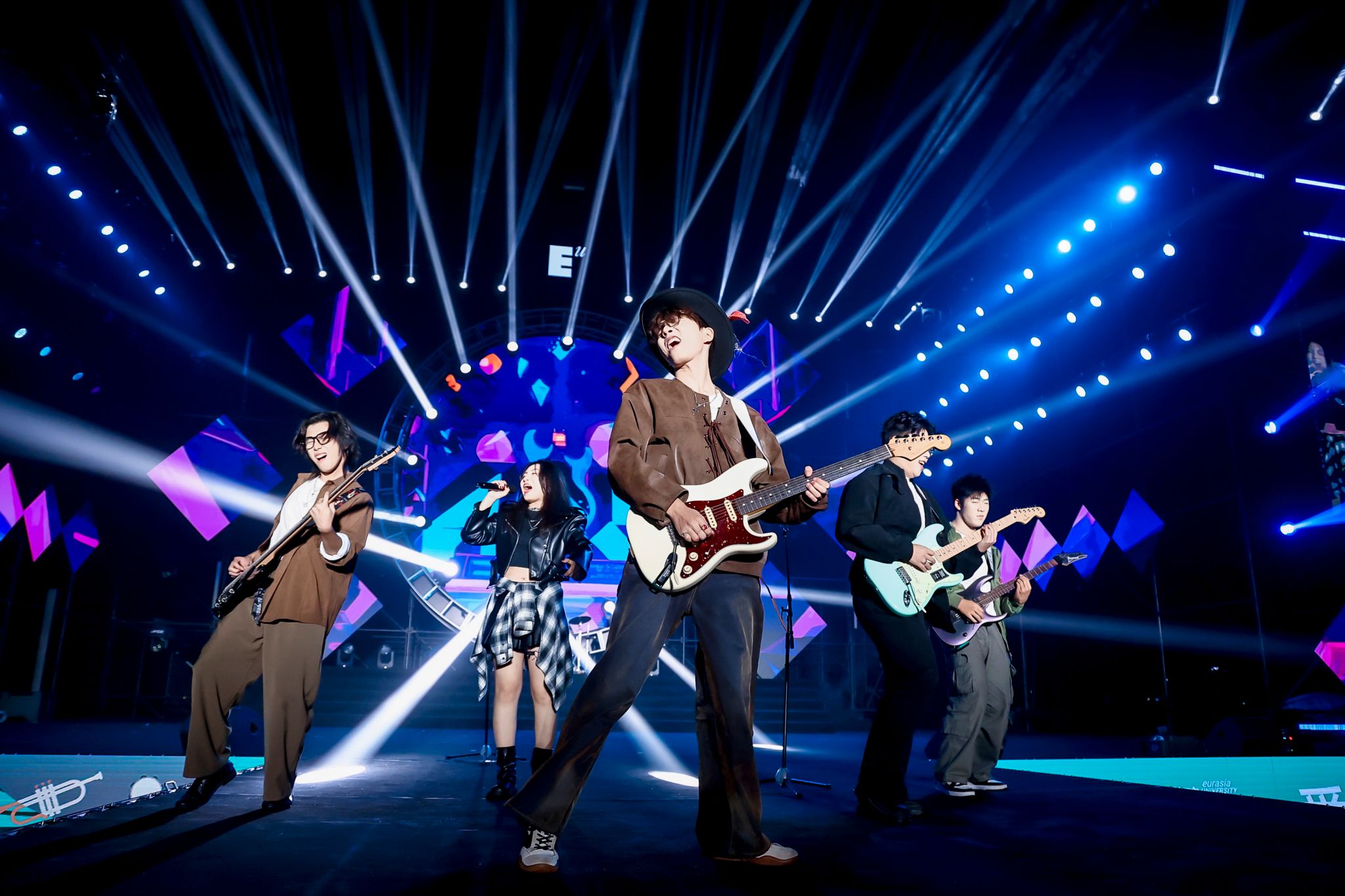 2024年10月,欧亚迎新生文艺晚会,大学生艺术团声乐团和吉他社学生在表演