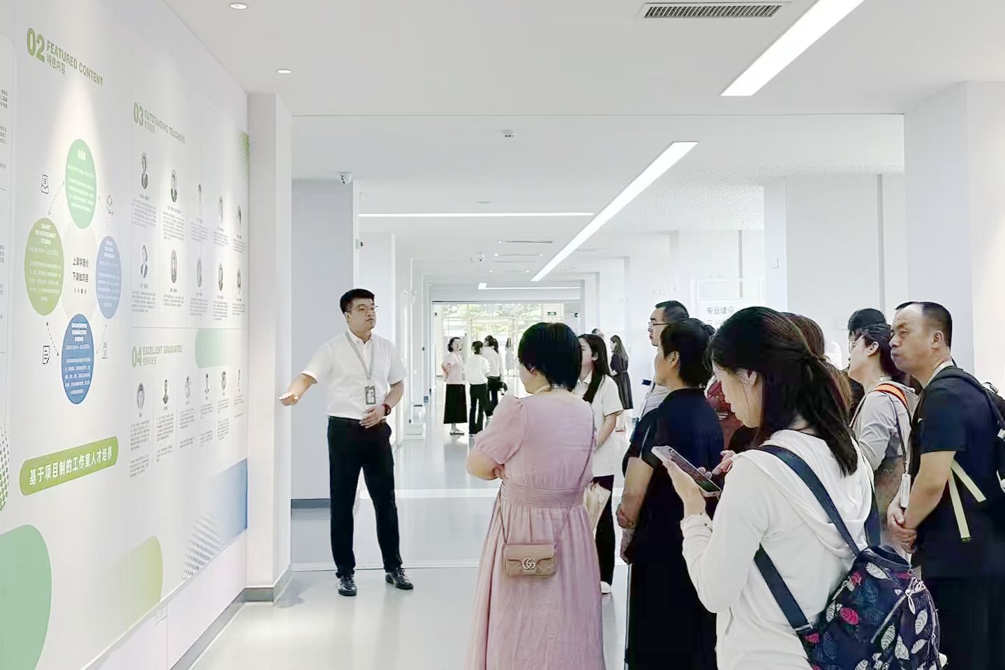 薛圣泽(左一)为来访高中老师介绍人居环境学院