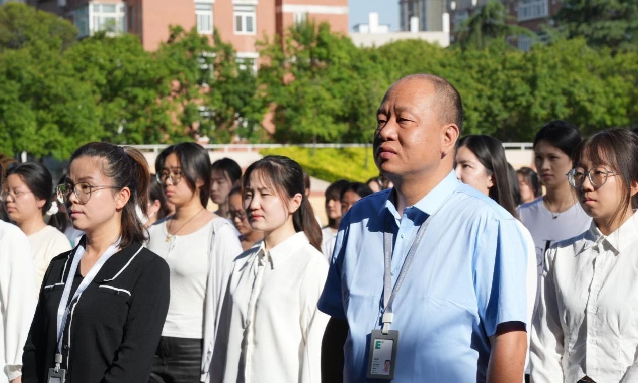 7点50分,全体肃立,庄严的国歌声中,五星红旗缓缓升起,全体师生向国旗行注目礼,深怀对祖国无限的热爱和崇高的敬意。