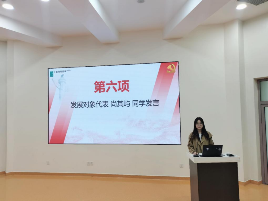 大会第六项:由学生第七支部发展对象代表尚其屿同学发言。首先,她代表发展对象培训班全体学员,感谢党组织的培养和关怀。随后她说,作为一名发展对象,必须时刻保持对党的忠诚,坚定理想信念,勇于担当,积极履行党员的义务和责任,将后续通过党课培训学到的知识和理论应用到实际工作中,为党和人民的事业贡献自己的力量。