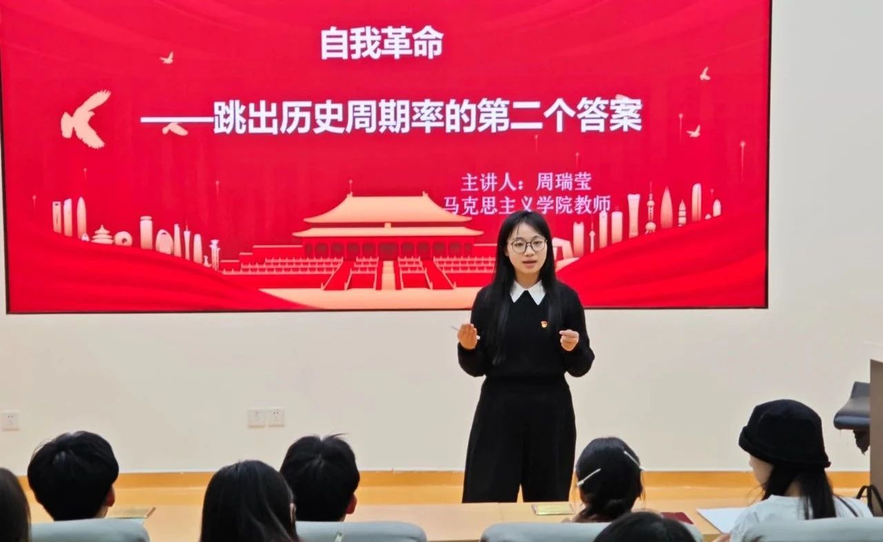 周瑞莹老师从理论逻辑、历史逻辑、实践逻辑三个维度,紧紧围绕勇于自我革命是马克思主义政党的政治品格、坚持自我革命是党百年奋斗取得的历史经验、坚持自我革命是应对新时代风险和挑战的现实要求这三个方面,为大家讲解中国共产党经过不懈努力和探索,最终找到“自我革命”这一跳出治乱兴衰历史周期率的第二个答案。