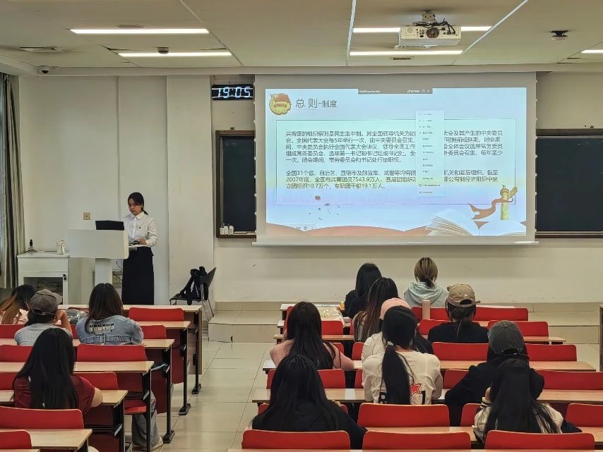 开始先详细阐述了中国共产主义青年团的性质、任务和使命,对团章中团员权利与义务的规定展开深度解读,让团员们对共青团有了更透彻、全面的理解。共青团以马克思列宁主义、毛泽东思想、邓小平理论、“三个代表”重要思想、科学发展观、习近平新时代中国特色社会主义思想为行动指南,这是强大的思想与行动指引。它所设定的奋斗目标,激励着广大青年为建设富强民主文明和谐美丽的社会主义现代化强国,最终实现共产主义而拼搏。共青团作为“广大青年在实践中学习中国特色社会主义和共产主义的学校”这一定位,赋予青年成长与进步的重要使命。