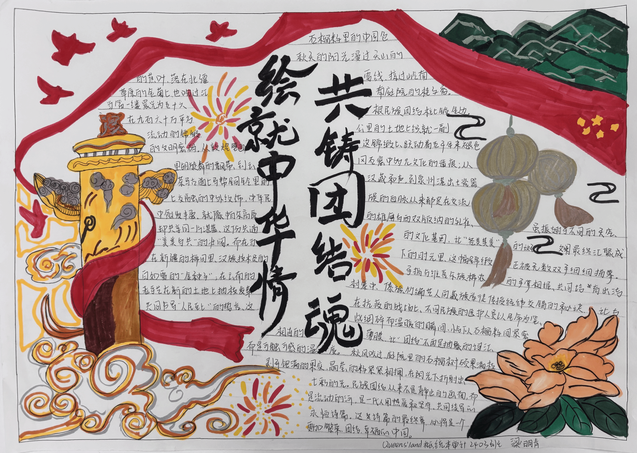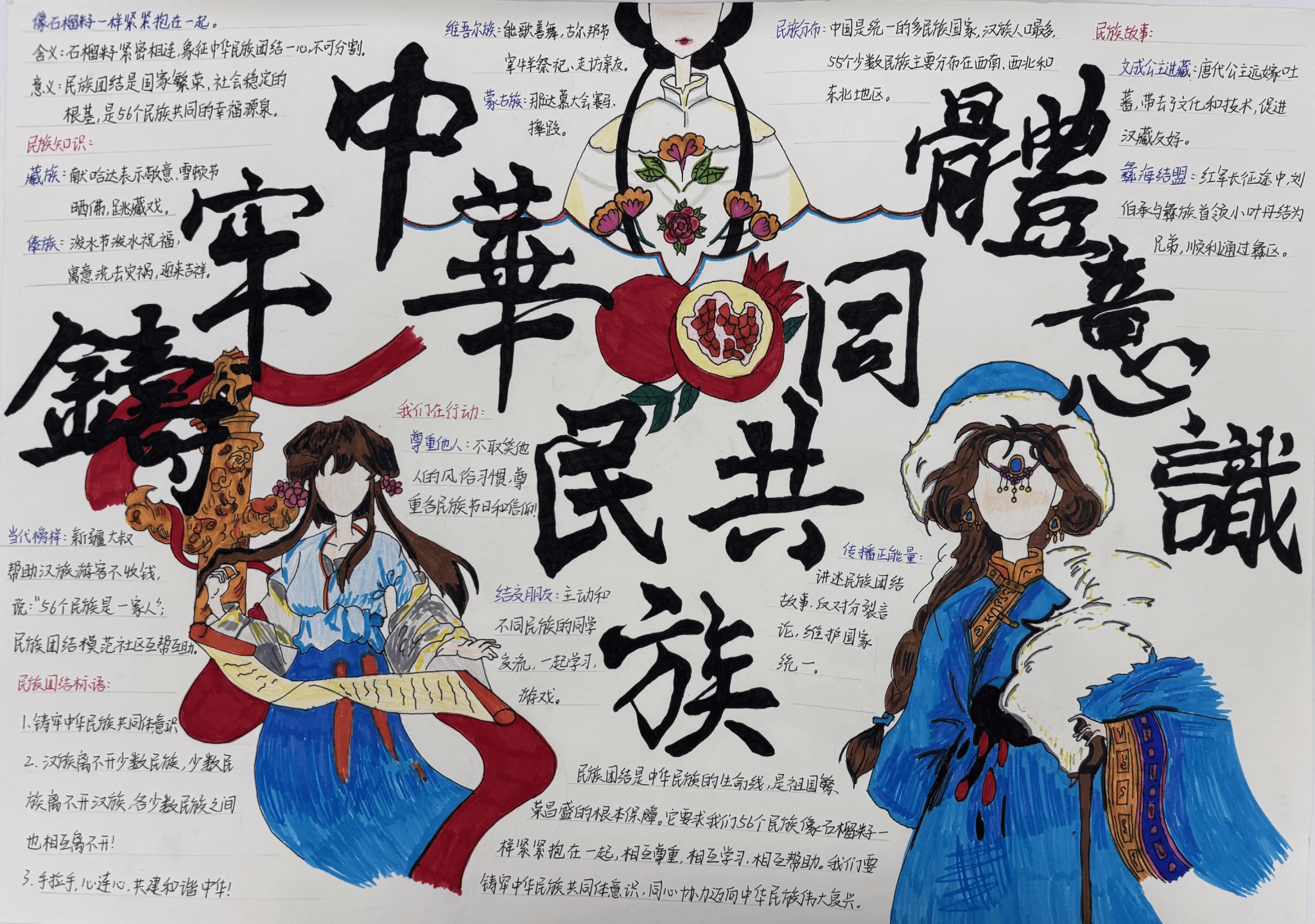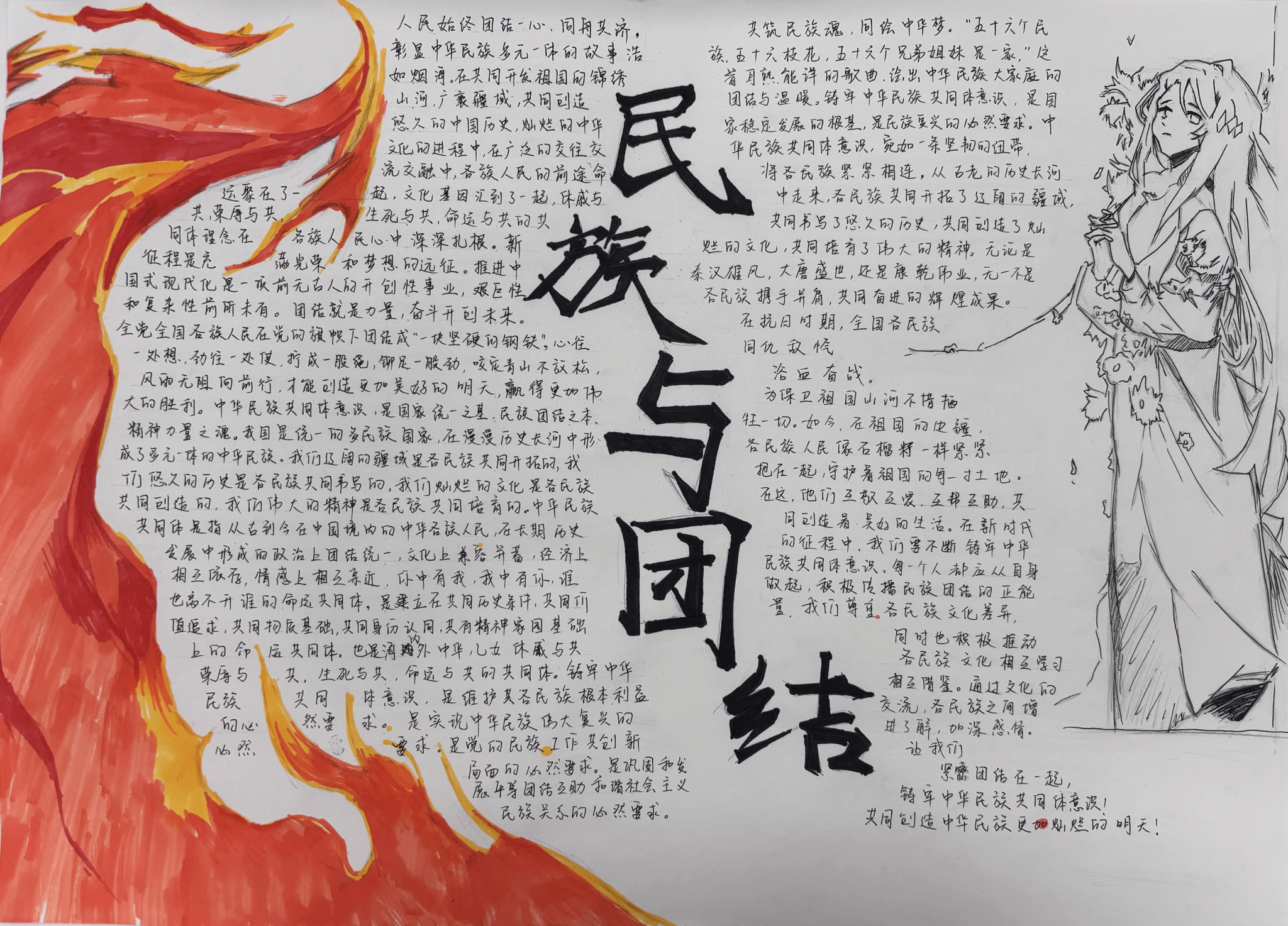 这些作品主题鲜明,内容充实,设计新颖。同学们围绕民族团结、中华优秀传统文化、祖国壮丽河山等核心元素,巧妙构思,精心创作。一幅幅作品或色彩绚丽,展现各民族服饰与歌舞的魅力;或笔墨含情,讲述各民族守望相助的动人故事;或版面精美,勾勒出各族人民共同繁荣发展的美好图景。经过认真评审,共有14份作品因立意深刻、设计出色、书写工整而脱颖而出,被评为优秀作品。下列是部分优秀作品展出: