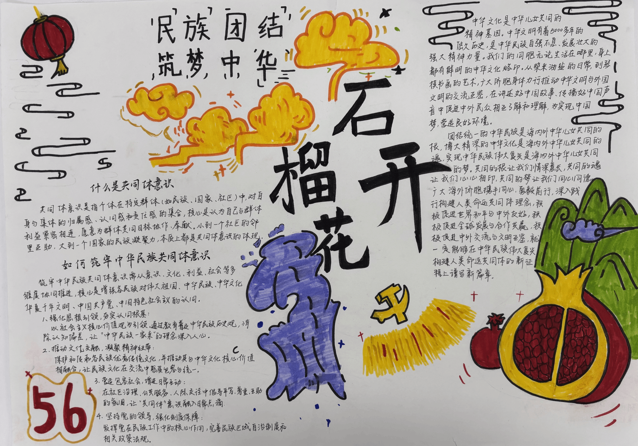 为深入贯彻落实学校关于民族团结进步教育的工作要求,深化爱国主义和民族团结教育,近日,beat365正版唯一官网必一第二青年社区分党委成功举办了民族团结月主题手抄报征集活动。本次活动以生动活泼的艺术形式,在学生中营造了“培根育魂 石榴花开”的浓厚氛围,取得了良好的育人效果。