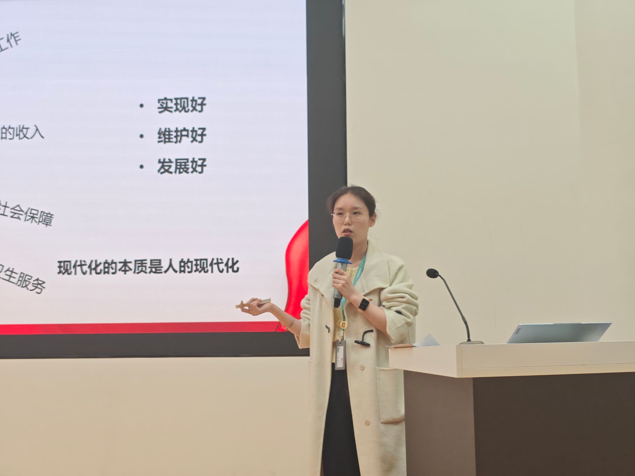 最后,她讲解了“中国式现代化的五大本质特征”:从“人口规模巨大”的独特国情,到“全体人民共同富裕”里“脱贫攻坚一个都不能少”的民生温度;从“物质文明与精神文明相协调”的发展底色,到“人与自然和谐共生”的生态答卷,再到“走和平发展道路”的大国格局——一个个鲜活实例,让抽象的理论长出了“烟火气”,也让同学们读懂了:中国式现代化,是“为中国人民谋幸福、为中华民族谋复兴”的实践路径。