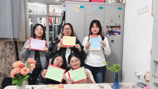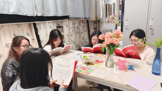 为了让红色精神常伴身边,读书会的最后一项活动,是共同布置宿舍“红色角”。大家分工明确、有序配合,一起为这个红色小角落贡献着自己的力量:有的将书写好的感悟笔记用夹子串起,挂成别致的“感悟帘”;有的将红色书籍分类摆放进简易书架,还细心地在每本书上贴了手写推荐语;还有的用一束玫瑰花进行点缀,让这个小小的角落瞬间充满了浓厚的红色氛围。