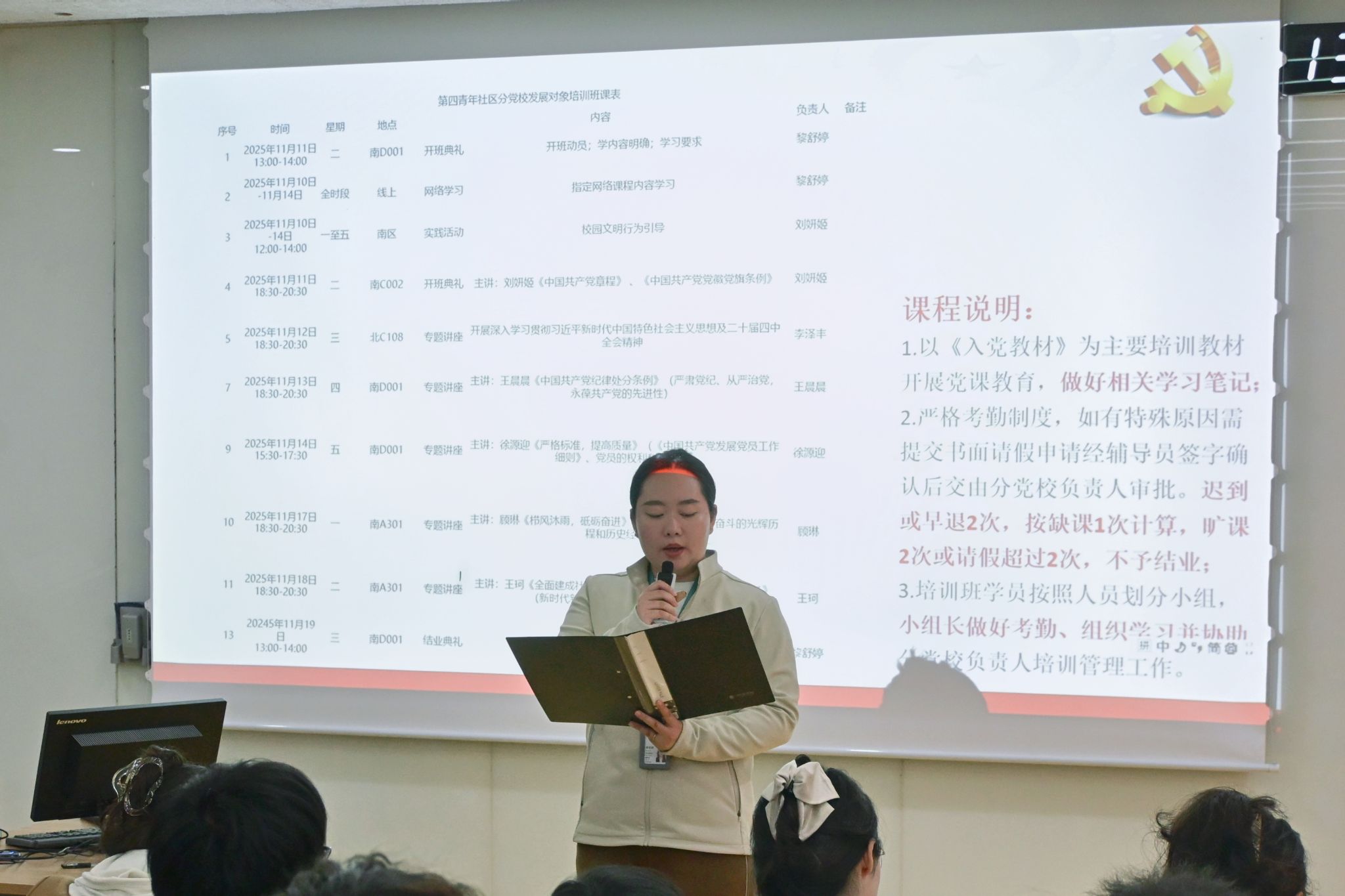 2025年11月11日,第四青年社区分党委在南D-001教室举行2025年下半年发展对象培训班开班典礼,分党委副书记黎舒婷、各学生党支部书记以及62名发展对象出席典礼。