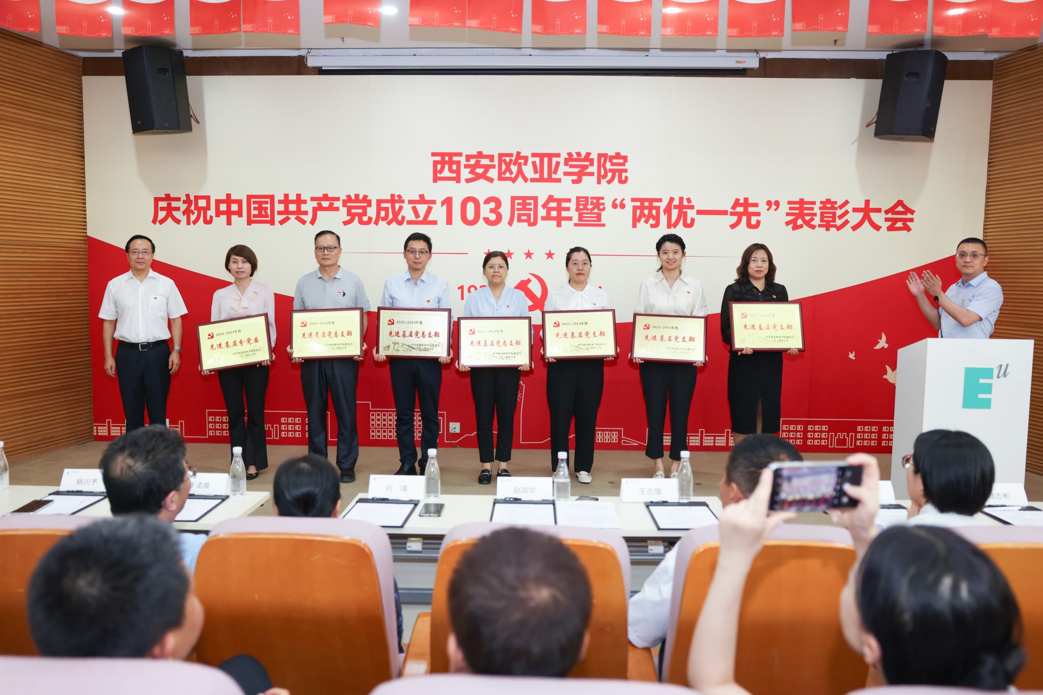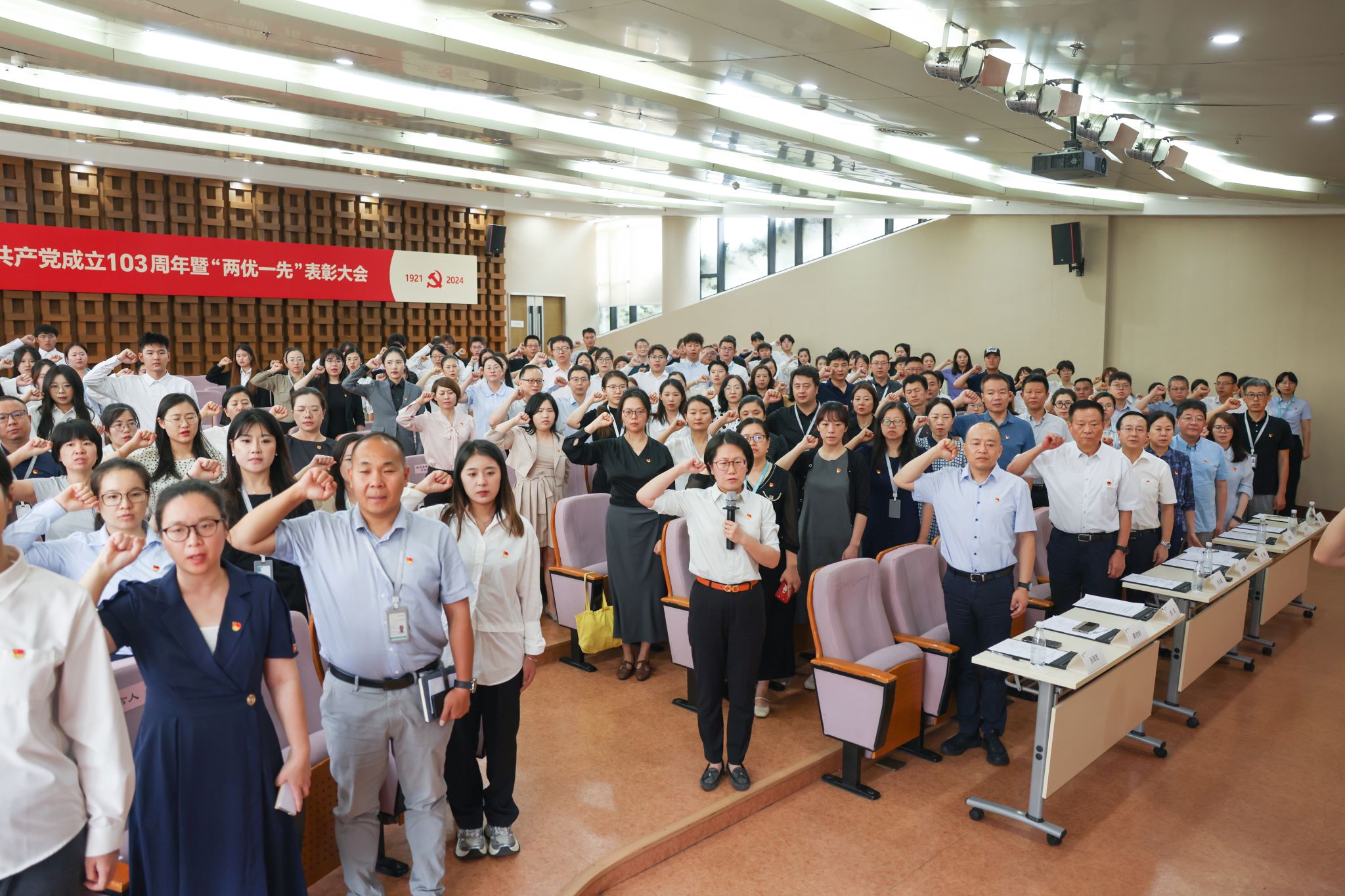 6月28日,学校庆祝中国共产党成立103周年暨“两优一先”表彰大会在图书馆学术报告厅举行。大会由党委副书记张军宏主持,学校党政领导、党委委员、纪委委员及师生党员代表近200人参加。