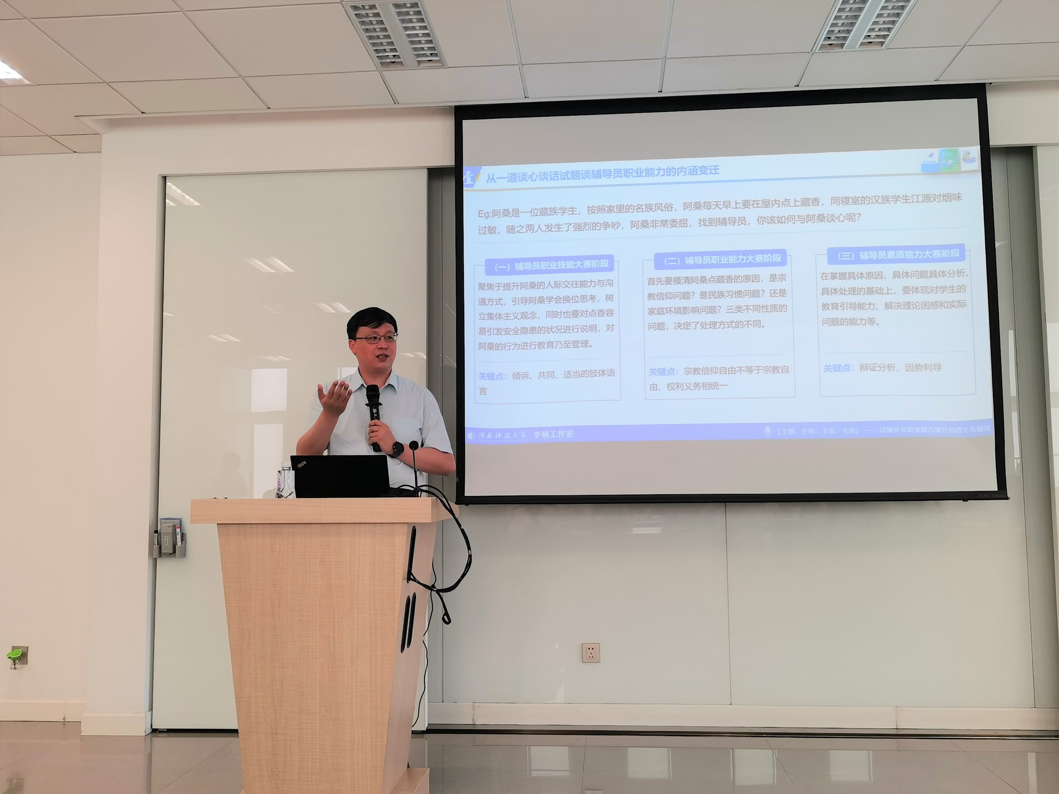 为进一步强化辅导员队伍建设,促进辅导员队伍素质能力提升,6月4日上午,全国辅导员年度人物、陕西科技大学网络思想政治工作中心主任李萌副教授应学生发展处邀请,为beat365辅导员做了一场主题为“主题、主线、主攻、主责——辅导员专业化成长的四个关键词”的专题讲座。来自各青年社区、分院学生事务组共56名辅导员参加了本次讲座。
