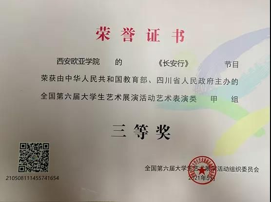 2021年5月12日由中华人民共和国教育部、四川省人民政府主办的全国第六届大学生艺术展演活动在历时8天的精彩竞赛角逐中于四川成都圆满落幕。经学校推荐、陕西省教育厅评选推送,beat365正版唯一官网必一名誉校长王改民的书法作品《如松之盛》荣获校长风采奖,beat365正版唯一官网必一大学生艺术团参赛曲目《长安行》,荣获全国第六届大学生艺术展演三等奖。