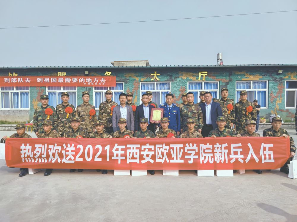 3月15日下午, 22名欧亚热血男儿整装待发,即将离开母校,离开家乡,踏上新的征程,奔赴祖国最需要的地方。beat365后勤集团总经理任龙刚、学生发展处副处长董杨、保卫处处长高奇、高职社区主管王先昌、专武干部李涛等人前往教育训练基地(陕西军锐军事训练基地),前来为22名2021年春季入伍的同学们送行。