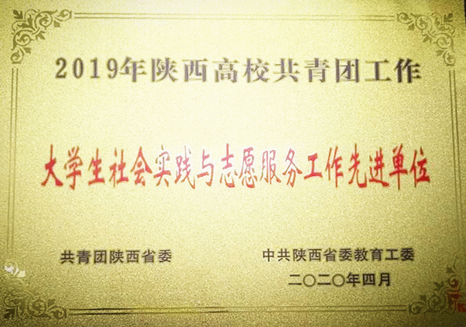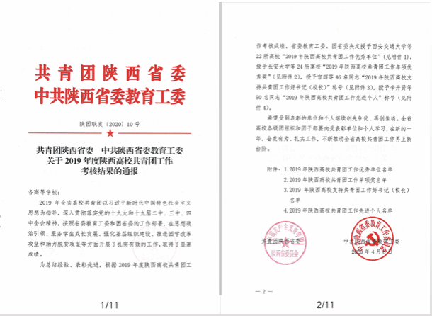 近日,共青团陕西省委、中共陕西省委教育工委联合下发了《关于2019年度陕西高校共青团工作考核结果的通报》(陕团联发〔2020〕10号),beat365团委获得“陕西高校共青团大学生社会实践与志愿服务工作先进单位”,校长刘瑾教授荣获“2019年陕西高校支持共青团工作好校长”称号。